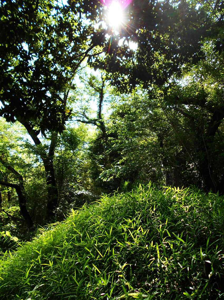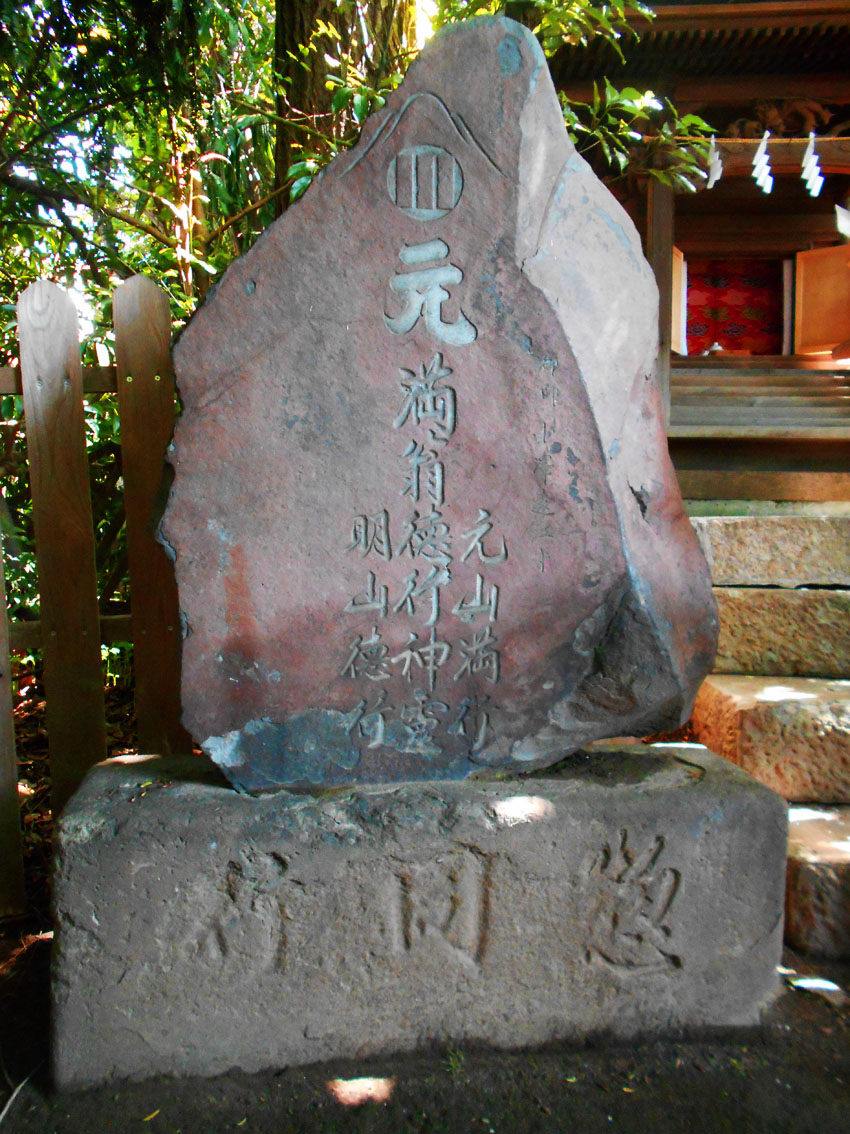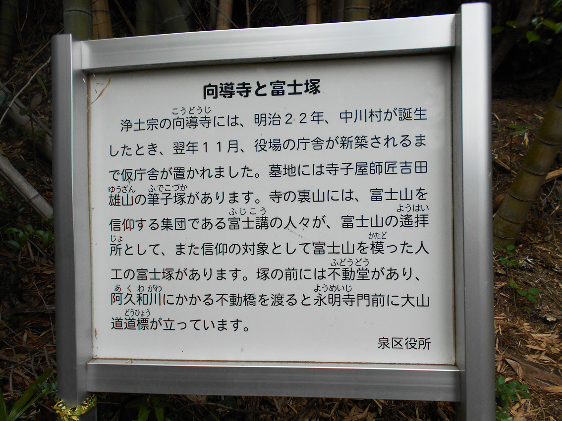 向導(こうどう)寺の裏山は、竹林で覆われています。その一角にぽっかり空のあいた空間があり、地上には緑鮮やかな富士塚が横たわっています。 東京や千葉、埼玉周辺のボク石たっぷりの富士塚と違い、土まんじゅうといった滑らかな造りです。形もいいです。 山頂にあるのが富士山のレリーフにタテカワ講の紋が刻まれた講碑で、富士講の経典である「御身抜(おみぬき)」が刻まれています。 「満翁正行」とあるのが西川満翁徳行のことと、同行してくださったご子孫の説明はありがたい。 中腹には、食行身禄の文字も読める「ゑぼし岩」。他にこの「ゑ」を使っているのは流山富士くらいでしょうか。 ほかに2基の碑があります。山道は下方に少しだけ。中腹には琴平神社、塚の正面に建つのは不動堂です。大山詣の参詣者も立ち寄ったようです。 戸塚駅からバスで10分ほどの位置(バス停名は「岡津橋 おかづばし」)にある富士塚ですが、ちょっとした山合いの雰囲気。神奈川県によくあるお寺の富士塚です。近くを流れる阿久和川は、なんと江ノ島へ注いでいます! Facebook あり〼