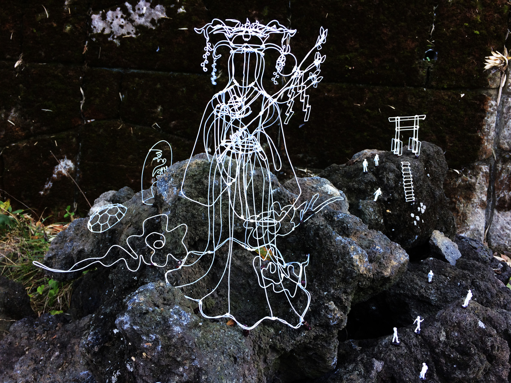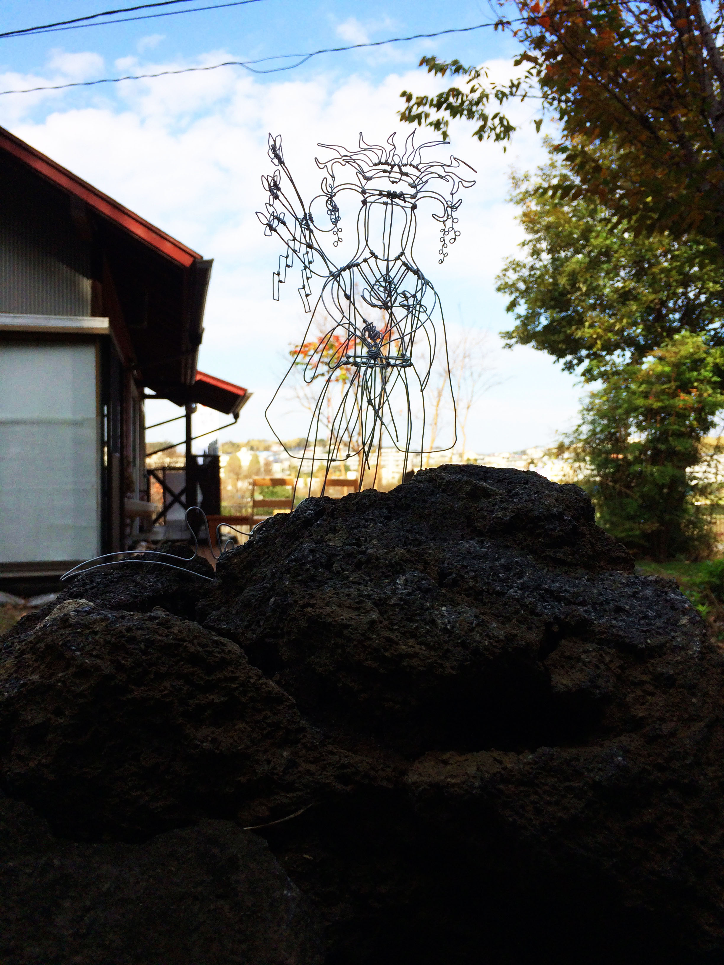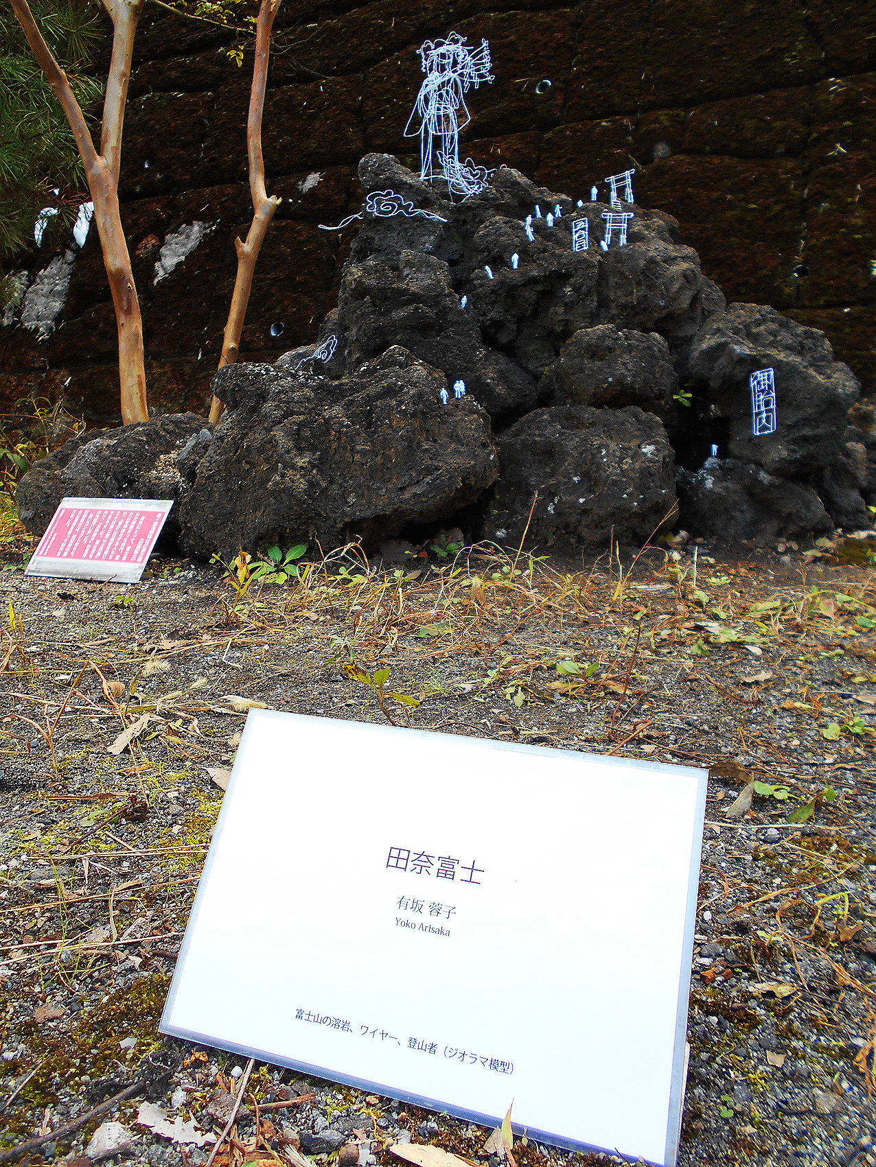 建材だったのかもしれませんが、そうでなかったかもしれません。 ともあれ、そのボク石を使って富士塚作品を制作してはどうかと 友人のディレクターからお話がありました。 もちろん、二つ返事でOKです。 「メタル富士」と違うアプローチを明確に出すべく、 キックオフ展である「はじまりはじまり展」で出した Lady Liberty の 「本地」とも言える Lady Konohana をビジュアライズしてみようと思いました。 左は神社でいただいた木版画のお札。右が私が制作したワイヤーワークのKonohana。 室内だとライティングでシャドウを見せることができますが、 黒ボクの上だとコントラストが美しい。 ほかには、鳥居や烏帽子岩、「五合目」「御胎内」などのサイン。 それに、ジオラマの18人衆。すべて白で統一しました。 ワイヤーワークとジオラマ人物はすべて、磁石を履いています。 溶岩は磁石を吸い寄せるからです。 Facebook あり〼