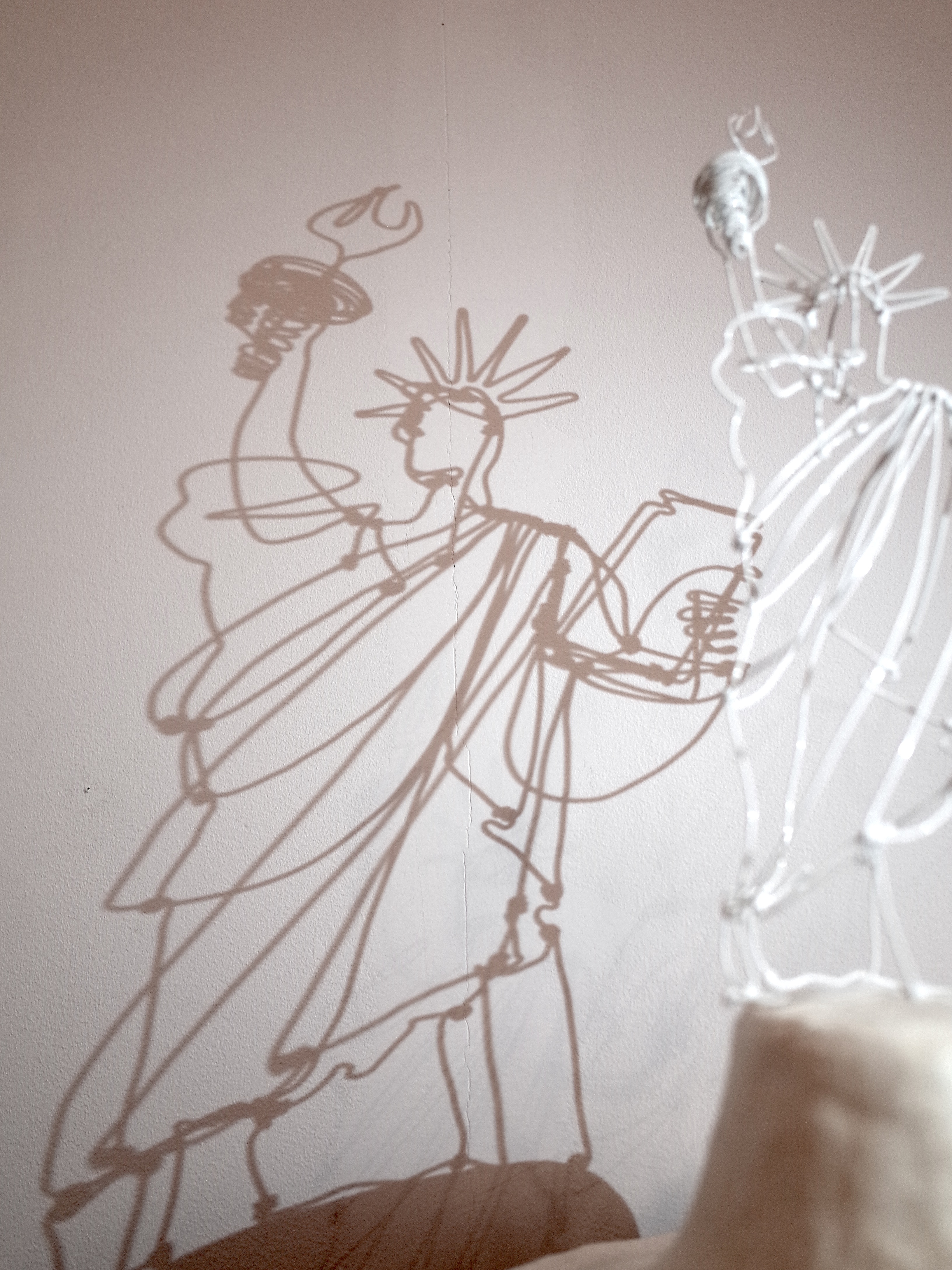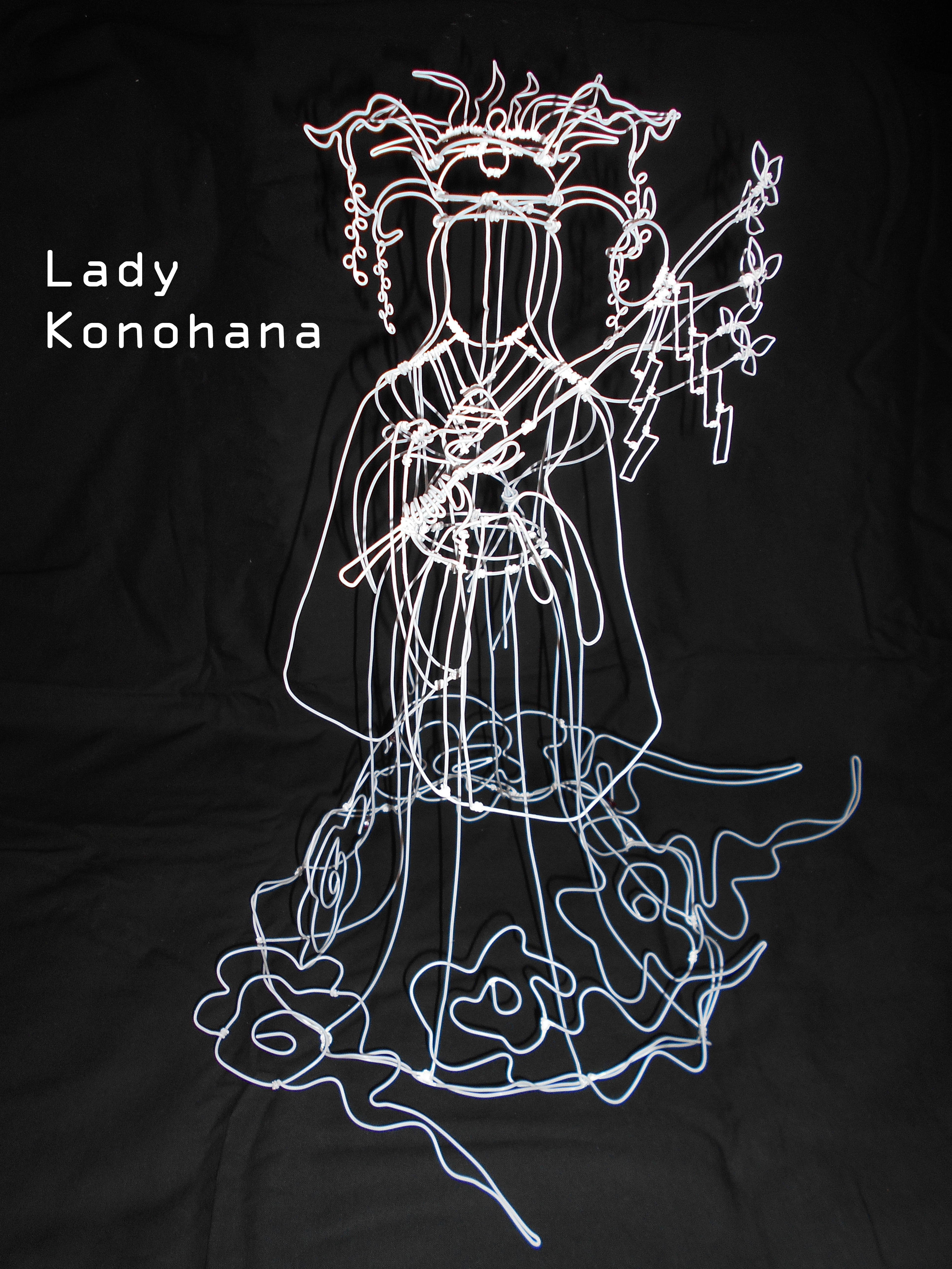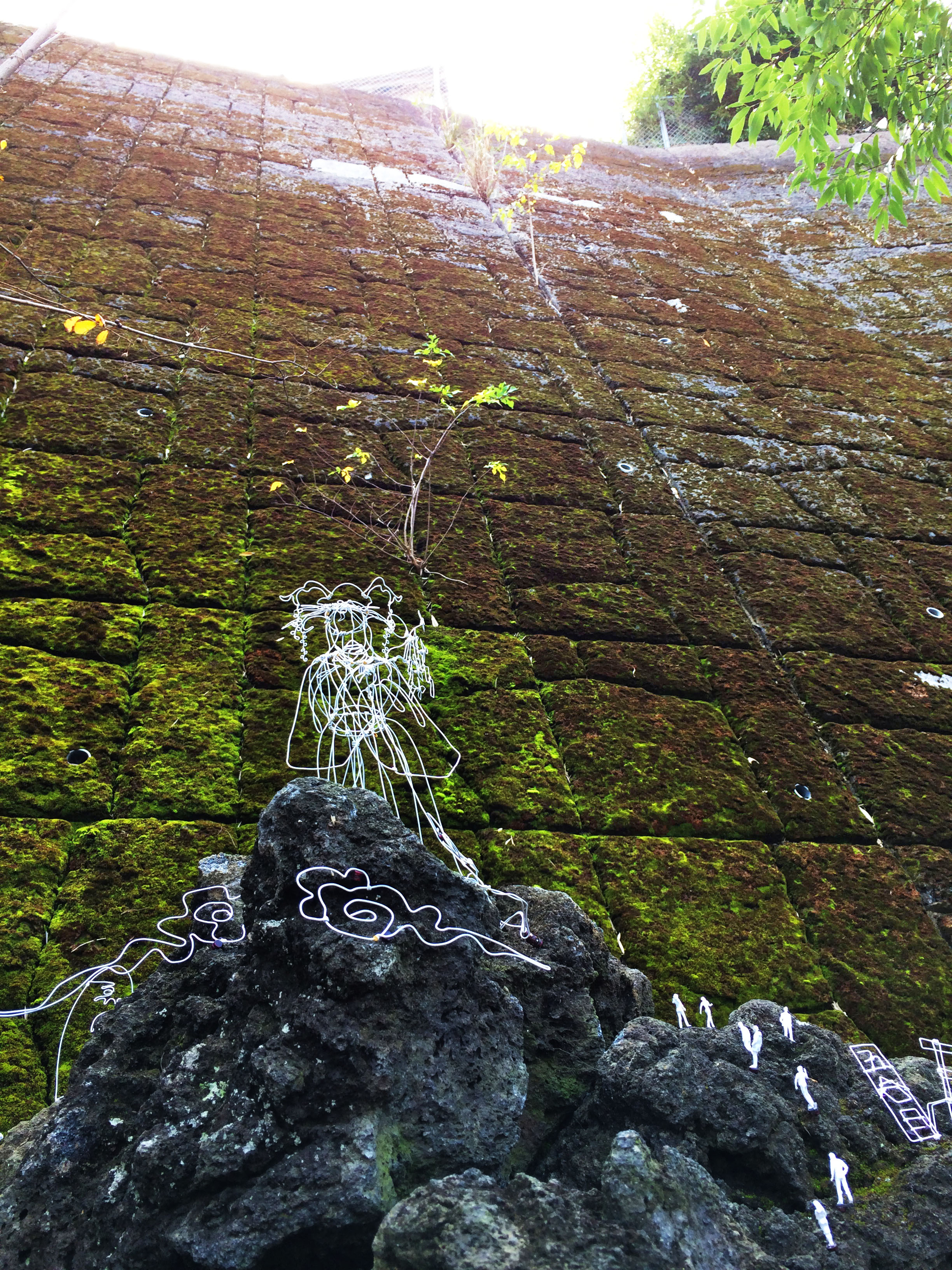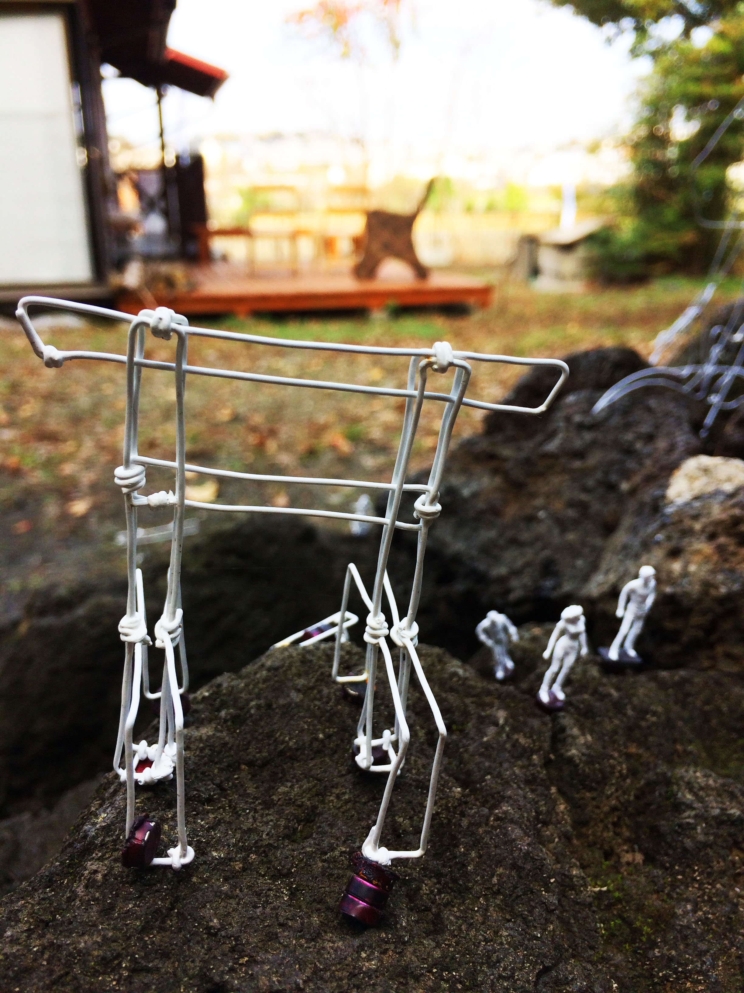 建材だったのかもしれませんが、そうでなかったかもしれません。 ともあれ、そのボク石を使って富士塚作品を制作してはどうかと 友人のディレクターからお話がありました。 もちろん、二つ返事でOKです。 「メタル富士」と違うアプローチを明確に出すべく、 キックオフ展である「はじまりはじまり展」で出した Lady Liberty の 「本地」とも言える Lady Konohana をビジュアライズしてみようと思いました。 左は神社でいただいた木版画のお札。右が私が制作したワイヤーワークのKonohana。 室内だとライティングでシャドウを見せることができますが、 黒ボクの上だとコントラストが美しい。 ほかには、鳥居や烏帽子岩、「五合目」「御胎内」などのサイン。 それに、ジオラマの18人衆。すべて白で統一しました。 ワイヤーワークとジオラマ人物はすべて、磁石を履いています。 溶岩は磁石を吸い寄せるからです。 Facebook あり〼