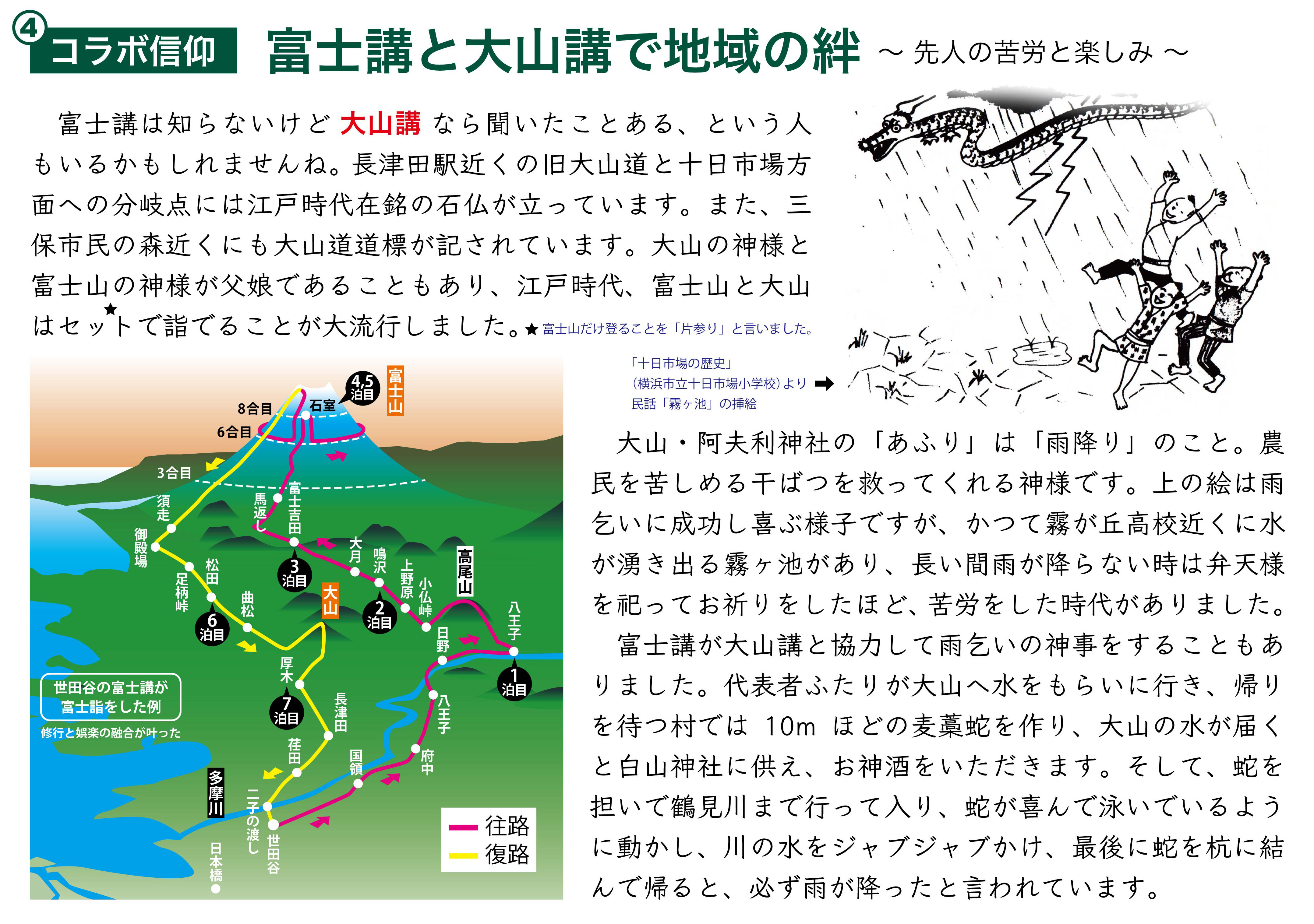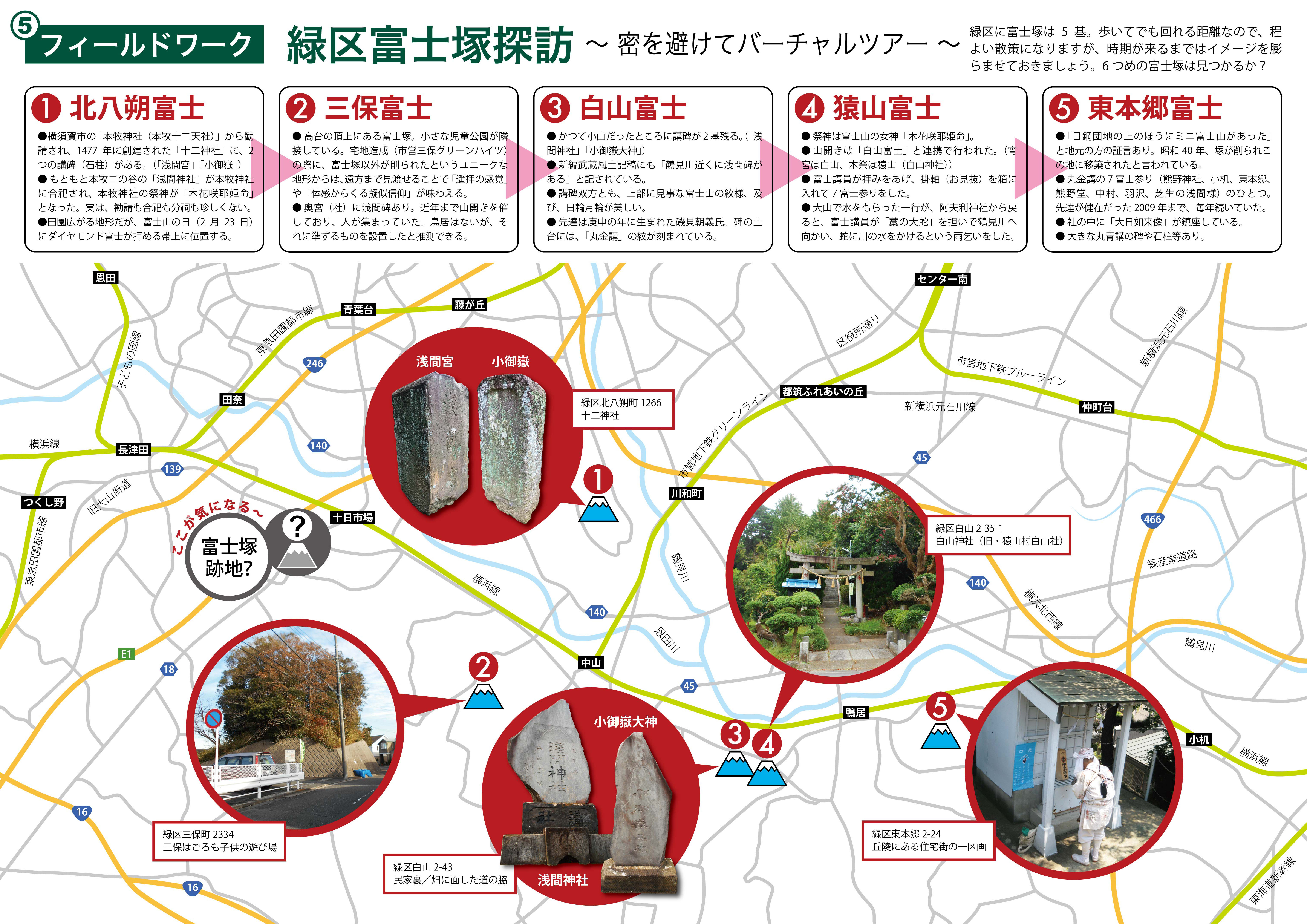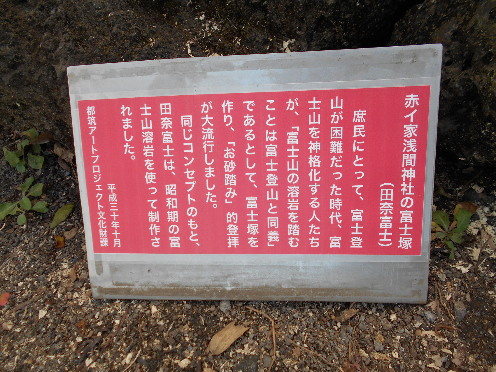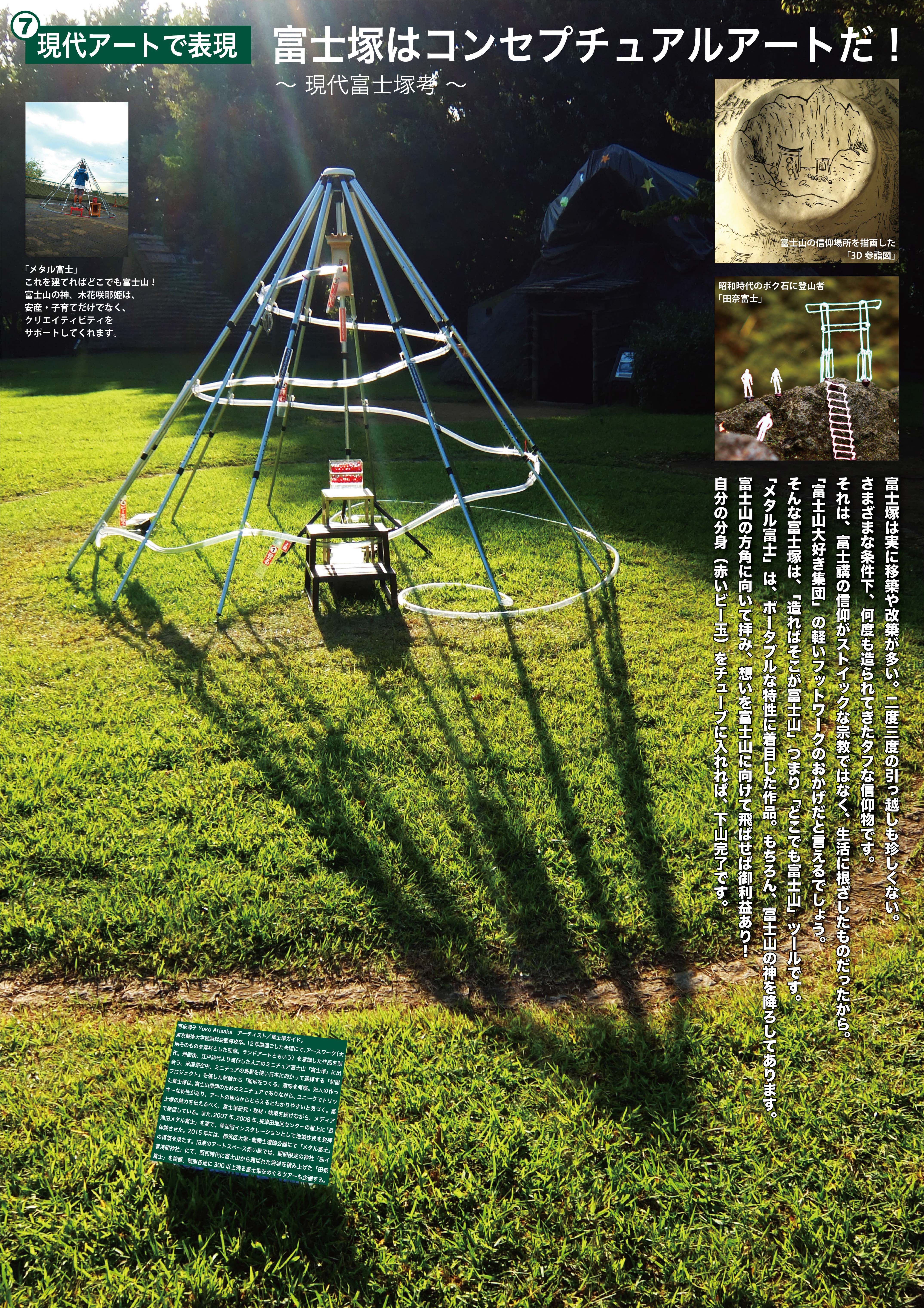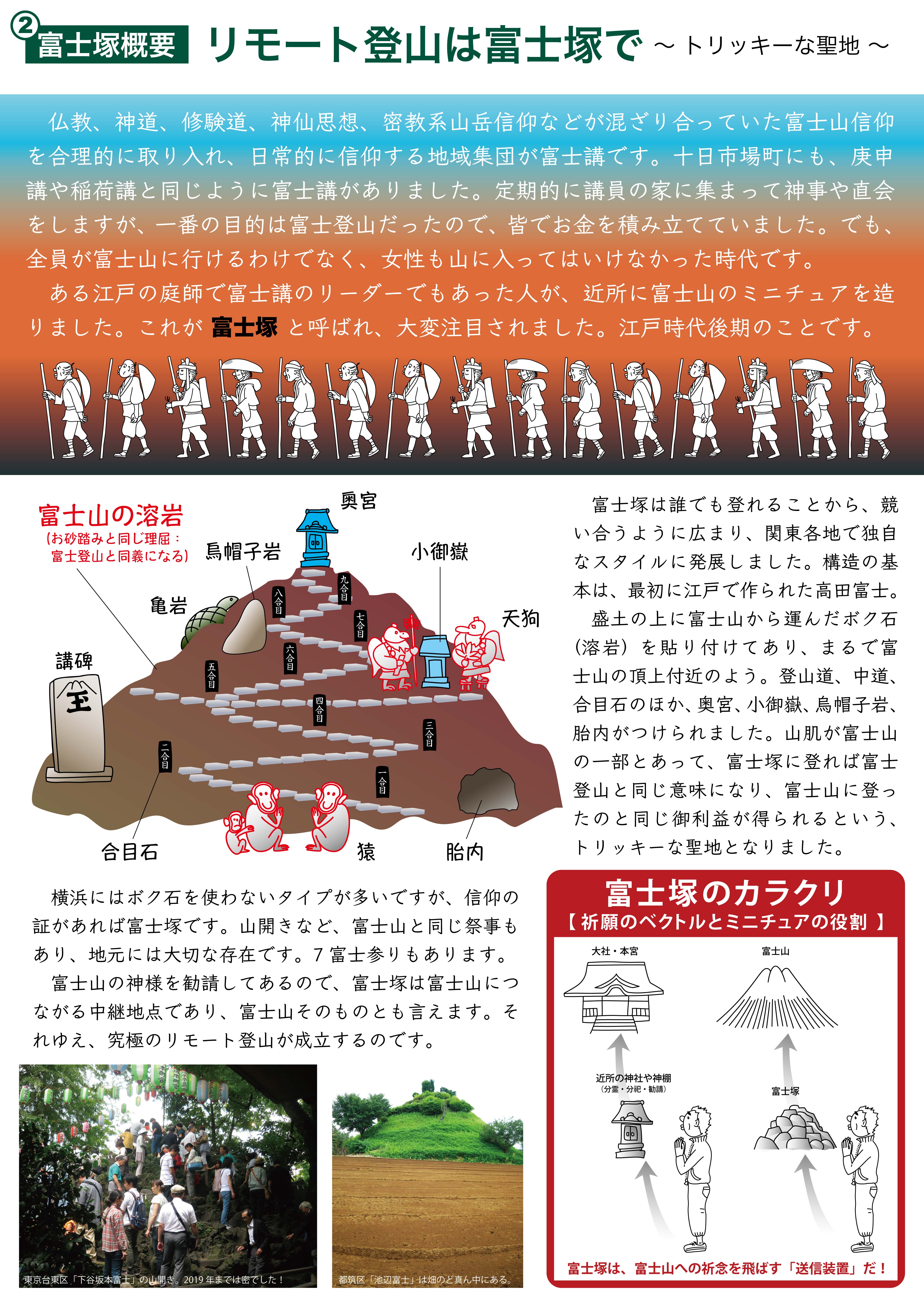 毎年参加している横浜市のアートプロジェクトですが、2021年は(ギャラリーでのアート作品の展示のほかに)、緑区の企画として富士塚関連の記事作品を展示させていただきました。(私にとってはすべてアートなのですが) まずは、アーティストとしての私がなぜ富士塚を紹介するのか、いや、富士塚はアートの側から紹介するほうがわかりやすい、ということがわかるプロフィール画像(下記に出てくる記事作品の部分)から。 十日市場という町で催された「十日市場まちかどアートフェスティバル」の一環として展示した7枚の作品です。 緑区の魅力のひとつに、「富士山が見えること」さらに「富士山の日(2月23日)にダイヤモンド富士が見えること」があります。かつて長津田でメタル富士を建て、例年富士塚ツアーを催してきた私には緑区とのご縁も深いです。富士山がよく見えることを土地の人たちはどのように関わってきたか、アートを通して表現し伝えることができるとして、JR横浜線の十日市場駅近くの建設中のマンションの囲い壁(キレイめな工事現場の壁)に、作品画像を貼付しました。期間は約3週間でした(10/30日(土)〜11月21日(日))。 コロナ禍でなかったら、区のバックアップで富士塚ツアーのためのバスをご用意いただけたかもしれません。以前の川口市のように。 では、7作品がどんなだったか、画像をここに貼っておきましょう。 ➀ 緑区と富士山 ➁ 富士塚概要 ➂ 富士塚と芸術 ➃ コラボ信仰 ➄ フィールドワーク ➅ プチ郷土研究 ➆ 現代アートで表現 5枚目の富士塚たちに関しては、別記事にいたします。 Facebook あり〼 「富士塚に登る」=「リモート富士登山」です。 富士山の神様を降ろしたことで、富士塚は、そこから富士山へ祈念を飛ばせる送信所となりました。 ただのミニ富士でなく、ネットワークで富士山と繋がる聖地となったのです。 したがって、富士塚に登拝するということは、概念的に、富士山に登っていることと同義なわけです。 Facebook あり〼