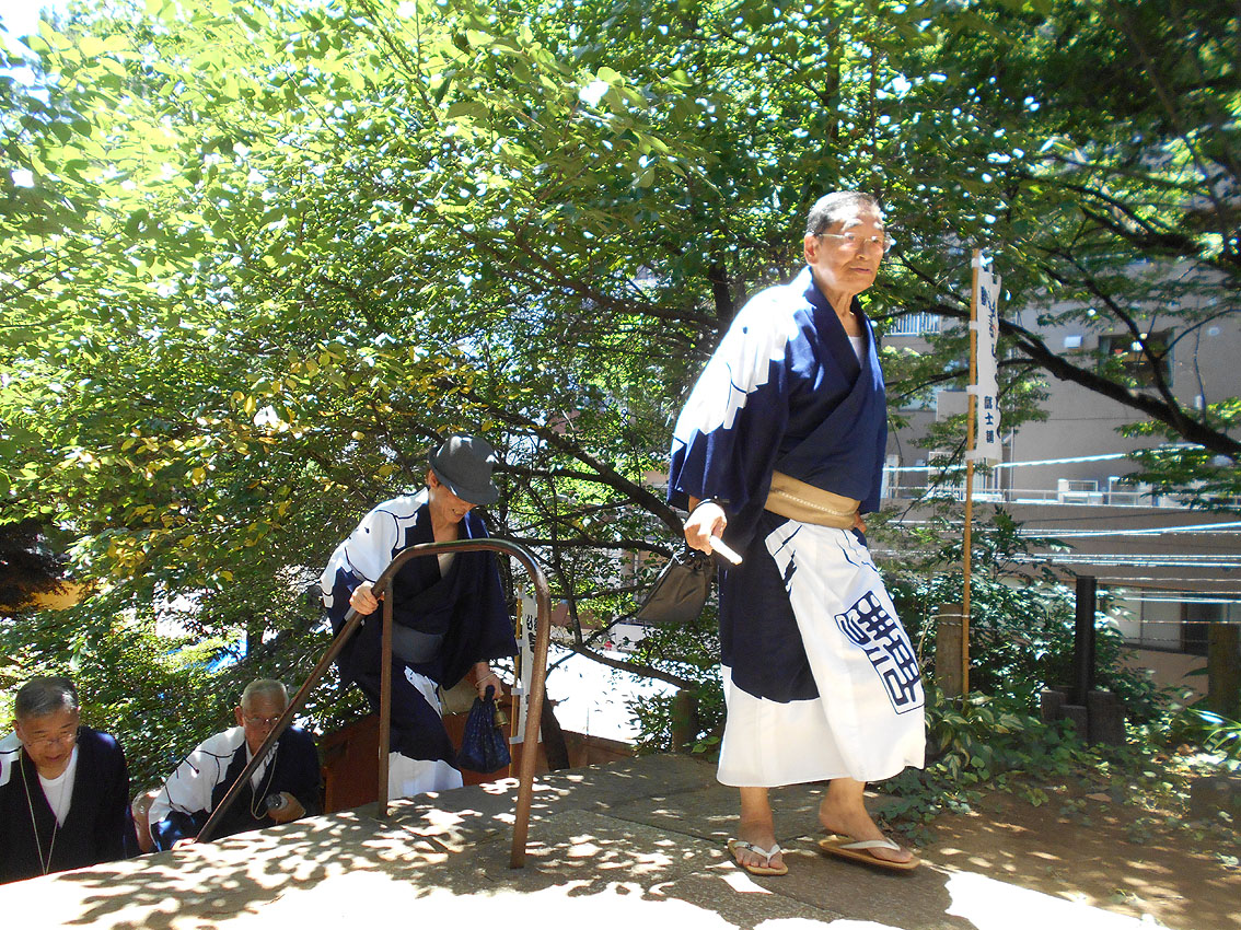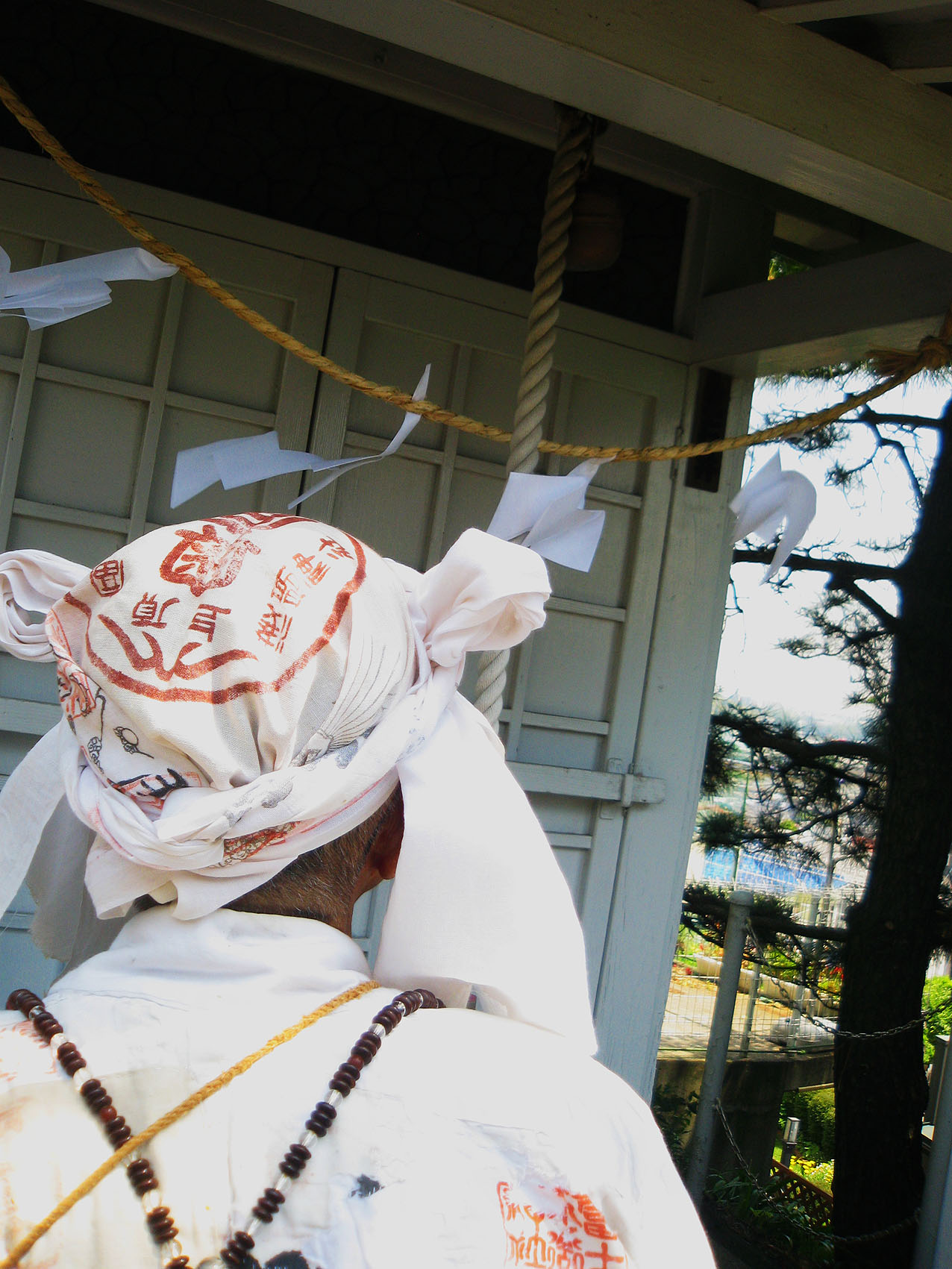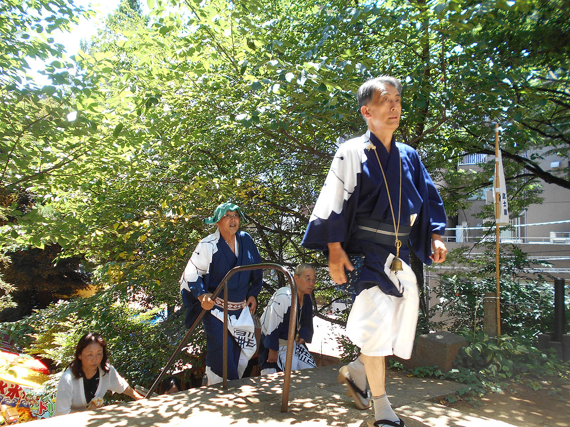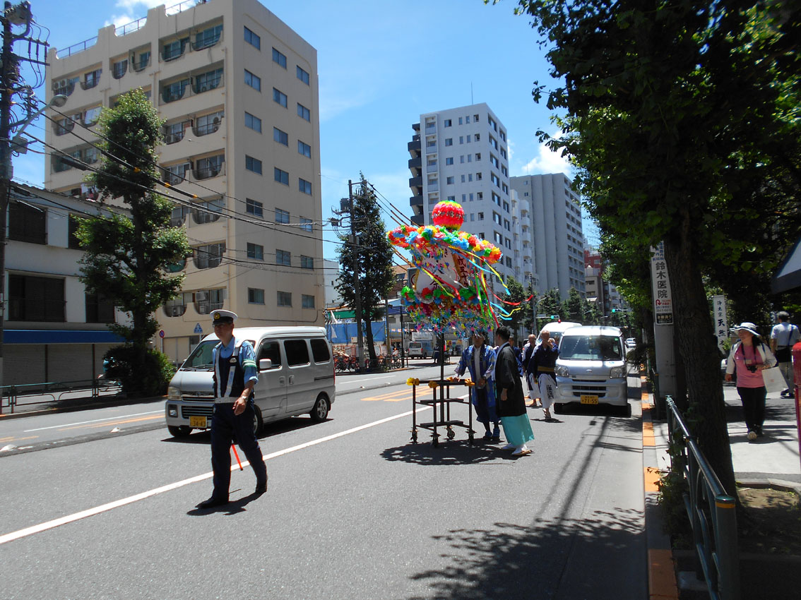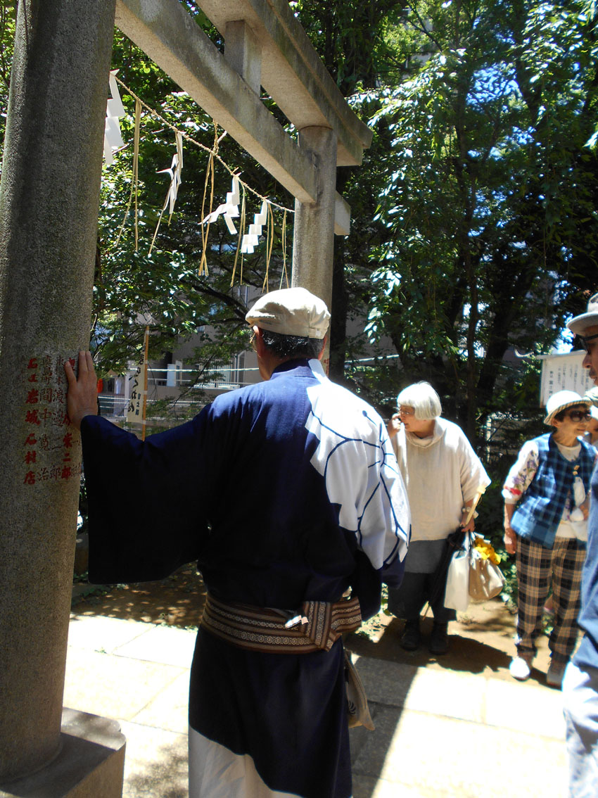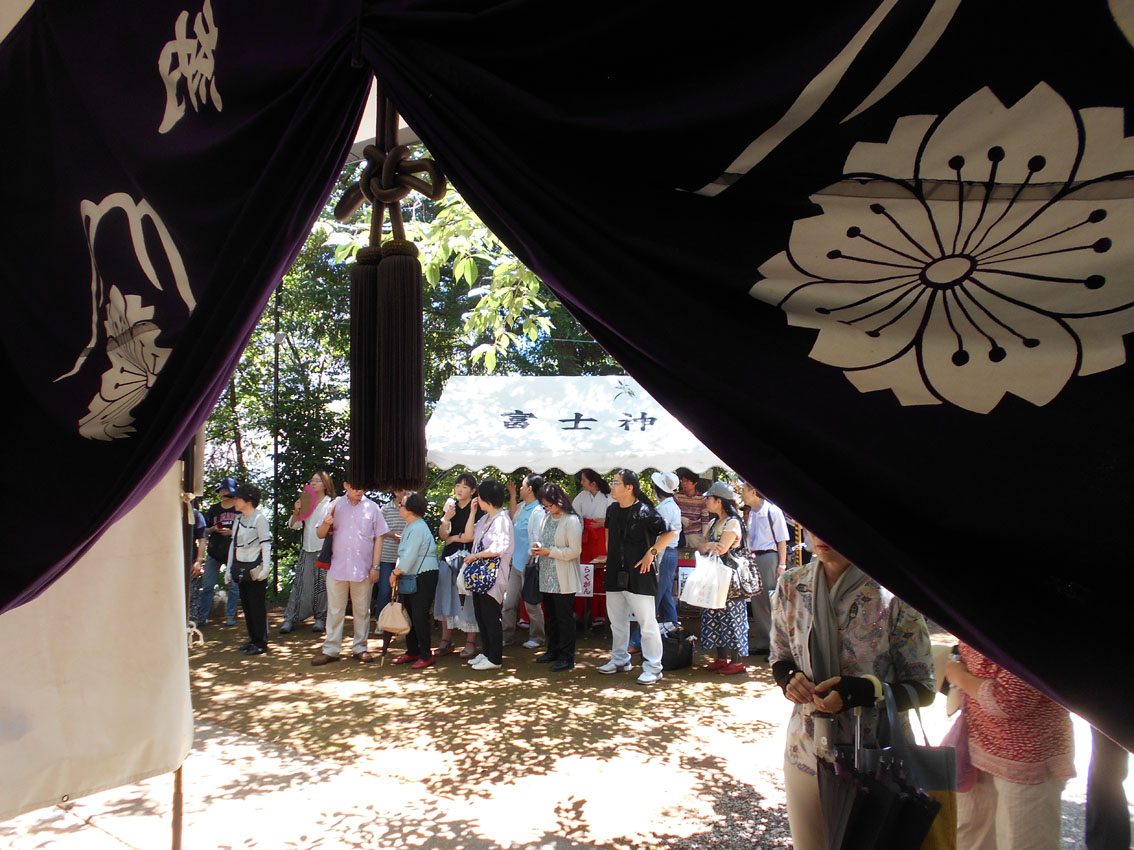 寂しいので、2年前の駒込富士の山開きの様子を少し書いてみます。 宵宮である6月30日に見られる「花万灯」はご存知ですか? 富士講の方たちが、富士山に見立てたカラフルな万灯(花傘で飾った高い行灯で、毎年鉄砲洲の富士講からの奉納だったそうです)を担いで、この界隈をねり歩くのを「万灯送り(回り)」と呼び、朝10時から始まります。 「万灯が駒込富士神社に戻ったら、お山開きの始まりですよ」という告知でもあります。享保の頃からあった慣習で、若月紫蘭(1879~1962)も「東京年中行事」の中で紹介しています。 古来陰暦六月の朔日を山開と云って、此日から富士登山を始めることになって居るに倣って、此祭は行はるゝので有って、二百年前までは、芝櫻田本郷町の富士神社より、當日左右の随神を此富士神社に送ることになって居たのが、争あってこのことを中絶し、今其随神(ずいしん)は駒込富士神社に飾られた儘になって居る。之を同時に久しく行はれて居たものには富士講中からもって来る萬燈が有る。萬燈と云ふのはつまり花傘を飾った高い行燈のことで、鉄砲洲の富士講中二三十名が、揃の★中形の打扮(いでたち)にチリンチリンと鈴振り鳴らして、エッサモッサと景気よく一つの大萬燈かついで来て、篝火を焚いた富士神社の境内を練り廻って、やがて之を社前に立て飾って帰るので有る。享保の頃から行なわれていたもので、今も引つゞいて盛に行はれて居る。 (★中形とは、江戸で生まれた型染めの文様で、小紋よりわずかに大柄のもの) 富士塚の上の富士神社で、花万灯を待ちます。 ちなみに、中腹にある胎内の中をなにげに撮影してみたら。。。 仏像らしき姿が映ってました。 石段の右脇にあるのと似て、大日如来のような衣装だけど、お顔が不動明王っぽいし、胴体と違って黒い。どなたでしょう。。。 Facebook あり〼