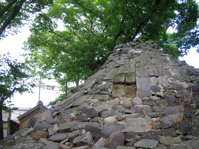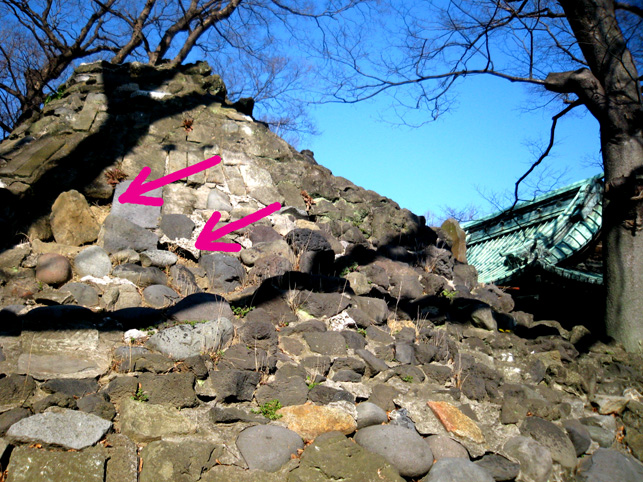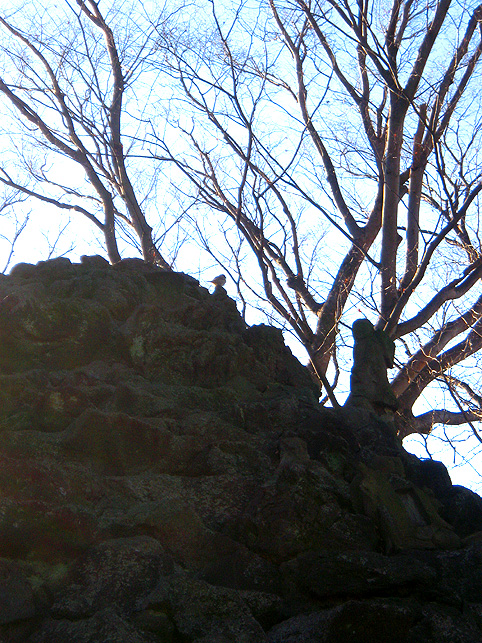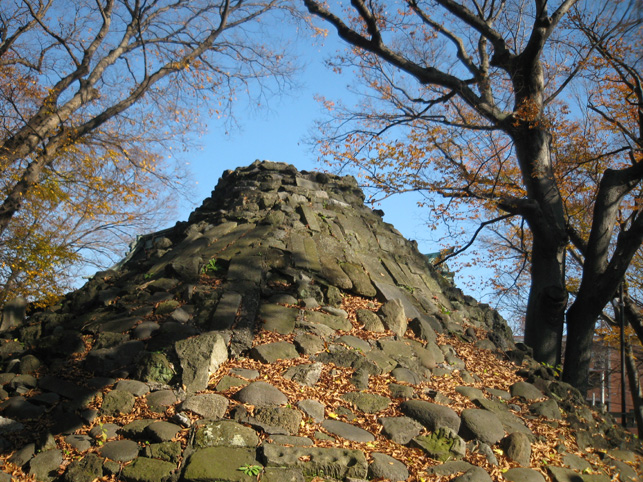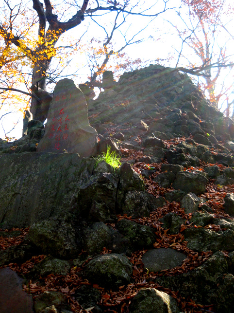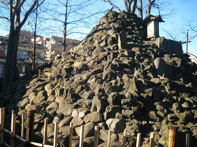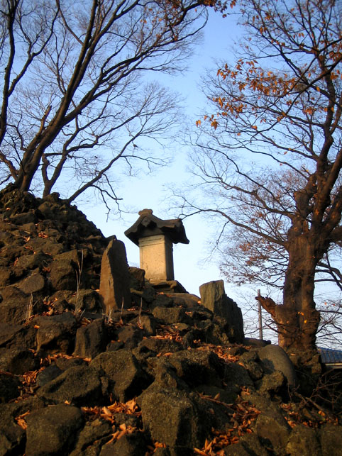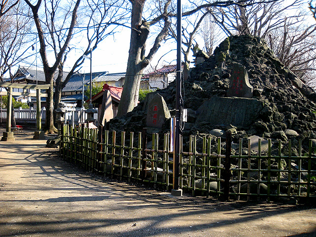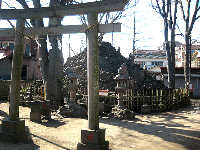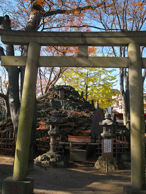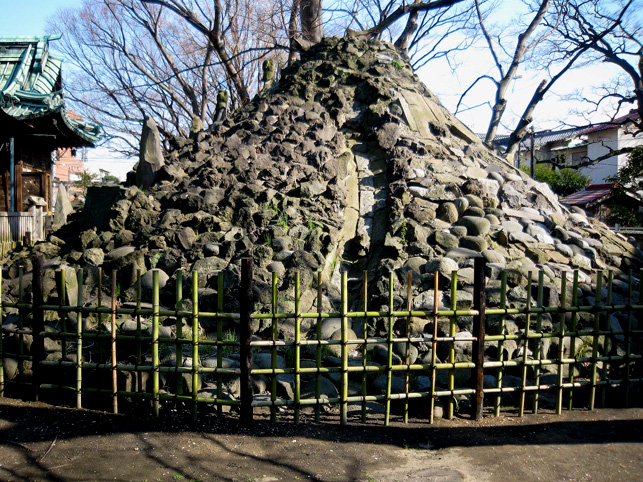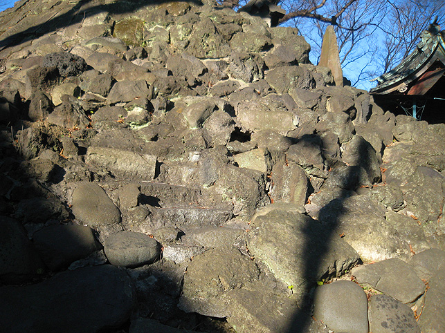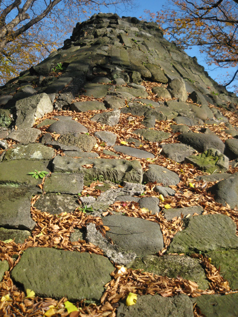 堀江富士は、典型的なコニーデ型。 銀杏の葉を背景に、シルエットが美しい。斜面を登る石像は山玉講の先達たち。知人のお祖父さんを含む、実在の人物です。 反時計まわりに歩くと、小御嶽の傍に育った雑草が緑鮮やかでした。 真裏にある、大澤くずれに落ち葉がたまっていました。 この富士塚はボク石は少なく、丸石と角石が多く使われています。特徴は頂上付近。カーブをつけるために、角石を横に配して留めてあります。現在は登拝禁止となり、竹垣に覆われていますが、以前はよく登っていました。頂上は平坦なセメント固めで、人ひとりが座れるくらい。確か、直径数センチの穴があり、細めの鉄柱でも埋まっていた痕跡のようでした。一度、改築されているはず。この塚の歴史を知りたいところです。 落ち葉に埋まっても塚の形は健在です。大谷石もかなり使われているのが特徴です。ミソの部分が風化して凹んでいます。
