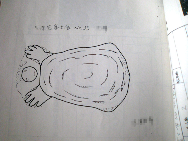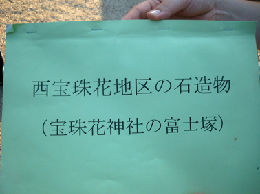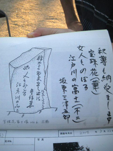 熱中時間のひとコマ。 日が暮れるまで頂上にいる私が映っていましたが、実は、地上から見上げた定点カメラも長時間私を追っていました。撮った映像を早回しにしたら、巨大な富士塚を登り降りする私の様子が面白かったのですが。。。 さて、この西宝珠花富士は、本には掲載せず見取り図も記録がなかったので、ロケの日に登拝しながらメモしていました。ところが下山してみると、 地域の方たちが待っていて、嬉しそうに私に見せてくれたのです。 「こんなのがあるんです」 「ひぇ〜!何ですかコレ♪」 そこには、この富士塚に乗っている全ての石造物の調査報告が記されていました。図版もあり。 立教大学の学生さん達による調査報告書でした。学芸員課の。 ふたつ前の見取り図はその中の一枚だったわけです。すごいや。サスガ! もちろんこれは非売品ですが、地元の方の御好意により、しばらく拝借しております。感謝です! いろんな石造物があるわけですが、地元の自慢はなんと言ってもこの歌碑。 中腹の登山道脇にある、板東三津五郎の歌です。 「釈尊も納受まします 宝珠華(花) 女人ものぼる 江戸川の不二(富士)」 実際は、文字が摩滅していてとても読めなかったので、これは有り難い!