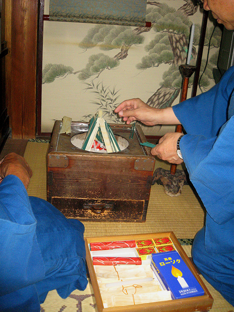 拝み箪笥の火鉢に建てられた線香の富士山に点火すると、