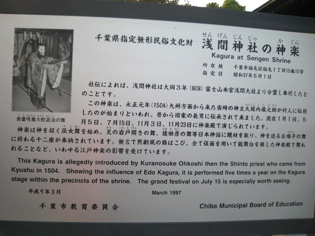お焚き上げの儀式は、通常毎月1回の月拝みの日に行なわれますが、今回、Eさんが講の方に取材を申し入れたところ、特別に儀式を披露してくださることになったのでした。 昔は、毎月3日13日16日17日と、4回も拝んでいたとのことですが、現在は17日のみ。それでも欠かさず行なわれているとは! お焚き上げは約20分。 「儀式が終わったら、皆で飲んだり食べたりするのがありまして……」 「直会ですね?」 「え?『ナオライ』なんて知ってるの〜?」 講元から驚かれました(笑)。 私は素性を明かさず見学させていただいたので、というか、まぁ一般的に直会に馴染みのある人はあまりいないのでしょうね。 ↑これは「浅間まんじゅう」。講元の奥様のお手製です。あんこは甘過ぎず、とっても美味♪地元では欠かせない食べ物だそうです。このあたりの富士講に女性は参加していません。奥様ほか、女性の方々は「子安講」/「安産講」に入っていて後に念仏講に移るとのこと。生活習慣が受け継がれているとはいえ、昔ながらの生活サイクルがしのばれます。 このほか、素晴らしく美味な「初秋刀魚」(8月上旬のことです)や、お寿司などを御馳走になりました。お酒ももちろん!本当にありがとうございました♪ 稲毛浅間神社の氏子の方たちに配られたという、立派な資料を見せていただくと、昔の写真が多数ありました。一の鳥居がこんな海の中だったことは知っていましたが、例大祭で歩くのは、桟橋と思いきや、小舟を並べた上に渡された橋だったのです(左上)。 今回おじゃましたのは、3丁目の富士講の方たちでしたが、1〜2丁目にも講があり、もっと活発に動いているらしいです。3丁目講社の先達はまだまだお若い方でした。講元(60代?)が富士講に入られたのは40歳のとき(それまでは青年会)とのことですが、先達も同じ道を辿っているようです。 この方たちは、稲毛浅間神社境内にある神楽殿にて、千葉県無形文化財に指定されている「十二座神楽」を舞います。出雲神楽が原型の江戸神楽の形態です。「11月23日に見に来てね」と。 1【巫女の舞】 2【猿田彦命の舞】 3【五穀豊穣祈願の舞】 4【事代主命の舞】 5【大国主命の舞】 6【三韓征伐の舞】 7【山神退治の舞】 8【鍛冶屋の舞】 9【大蛇退治の舞】 10【扇の舞】 11【天の岩戸開きの舞】 12【御囃子の舞】 (看板の解説にあるように)講元のO氏が旧家の長男ですが、なんとこの方は平家の末裔だとか。源頼朝由来の稲毛浅間神社で舞うわけで……面白いですね。