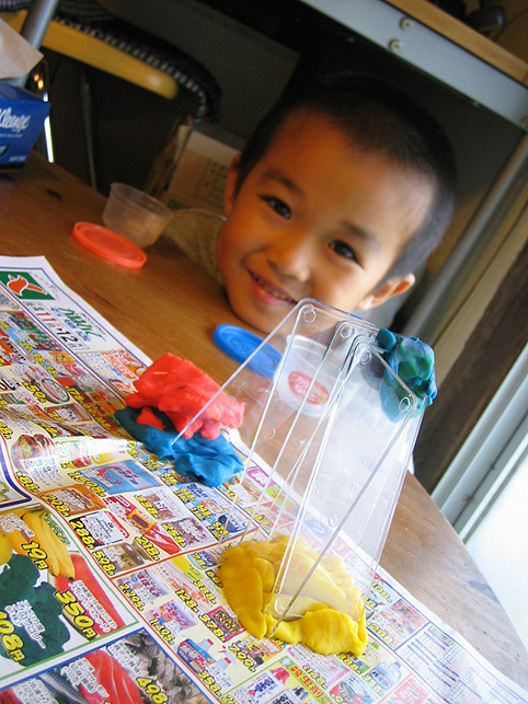 昭和5年、乃村工藝社が「両国国技館に人工富士山を作り、観客を登頂させました」が、それに遡ること2年、昭和3年には講談社が「富士山大展覧会」を開催していました。場所は大阪。 ↑これはその時のポスターです。右上には、富士山頂上の奥宮でいただける御朱印が捺されていますね。後援は文部省や山梨県、静岡県など。 「大阪で富士登山が出来る」と、うたっていますが、高島屋での催しですから、本当に登れる人工富士山がつくられたのかどうか。もしかしたら、登れるというのはシャレだったのかもしれません。「富士百選」として数々の富士山図が出品されたようですので。 このポスターは、先月7日まで文京区の講談社 野間記念館の「富士を仰ぐ。 重要文化財『古谿荘』竣工100年記念 近代日本画」の中で展示されていました。 ふたたび、乃村工藝社に戻ります。 一番記憶に新しいものは昨年の実物大ガンダムですが、もちろん昔から多岐にわたり制作していますね。 私にとって印象深いものは、竹富島ビジターセンター 竹富島ゆがふ館です。 八重山の竹富島にこの施設ができた時は驚きました。映像やパネル、ボックス、音響をふんだんに取り入れ、そのセンスとバランスのよさに一流の仕事を感じました。 ちなみに、ゆがふ館内休憩コーナー付近に、私が創ったオブジェも置かれています(まだあるかは不明ですが)。 富士塚のオブジェを創るように、この島の聖地である御嶽(うたき)を箱詰めにしたものです。(写真コラージュとミニ鳥居) 種子取祭の奉納芸能が行われる「世持(ゆむち)御嶽」は、広い空間があります。神様のいるところは正面奥ですが、向かって右側には弥勒奉安殿があり、その奥にはクスクムリと呼ばれる築山(火番盛)があります。 聖地のミニチュア作品をつくるのは、私のライフワークでもあります。 この島には、小さなトモダチが住んでいます。彼が小学校に上がる前、粘土遊びでこんな富士塚(?)ができました〜♪ 【オマケ】脈絡なくもうひとつ。 八重山を訪れる前後に、那覇に寄ることもあります。 ある時、町を歩いていたら、ものすごい形相で自転車をこいでいるエンケンさんのポスターに目を奪われました。マジで沖縄までチャリこぎをしてやって来そうな気迫の1枚でした。 「幾つになっても甘かあネエ!」 そして、良質の映画やライブやイベントで定評があり、オープン当時から私もお気に入りの桜坂劇場に、エンケンさんがやって来るとわかりました。 確か、映画「ボブディランの頭の中」を観た後、桜坂社交街(新宿ゴールデン街のようなところと言えばよいでしょう)で飲んでいたら、エンケンさんを那覇に呼んだという主催者の方がいて、「滞在日数を延ばしてでもエンケンさんに会うべきよ〜」と言われました。結局かないませんでしたが。。。 桜坂劇場でのイベントは、エンケンが監督/主演/音楽を担当してつくったライブ映画「不滅の男〜エンケン対日本武道館〜」の上映のためでした。 なぜこの映画のことを書くかというと、サブタイトルは「エンケン対日本武道館」となっていますが、私にはエンケン対富士山に思えたからです。 武道館内に200台のアンプを積み上げて「富士山」を築き、エンケンは富士山六合目に住んでいるという設定です。このとてつもない構想、そしてそのエネルギーも彼ならではですが、やはり思うのは、表現者にとって富士山は、愛でながらも挑みたくなる「特別な存在」なのだということ。彼が積み上げたアンプの山(富士山と明確に名づけています)は彼にとってパワーの集積であり、と同時に、富士山という聖地の住人になって生き延びるという望みの表れでもあります。私から見れば、エンケンの富士塚ですね。 ちなみに、エンケンさんのライブは一度だけ観たことがあります。東京カルチャーカルチャーの階下、ZEPP TOKYOにて。