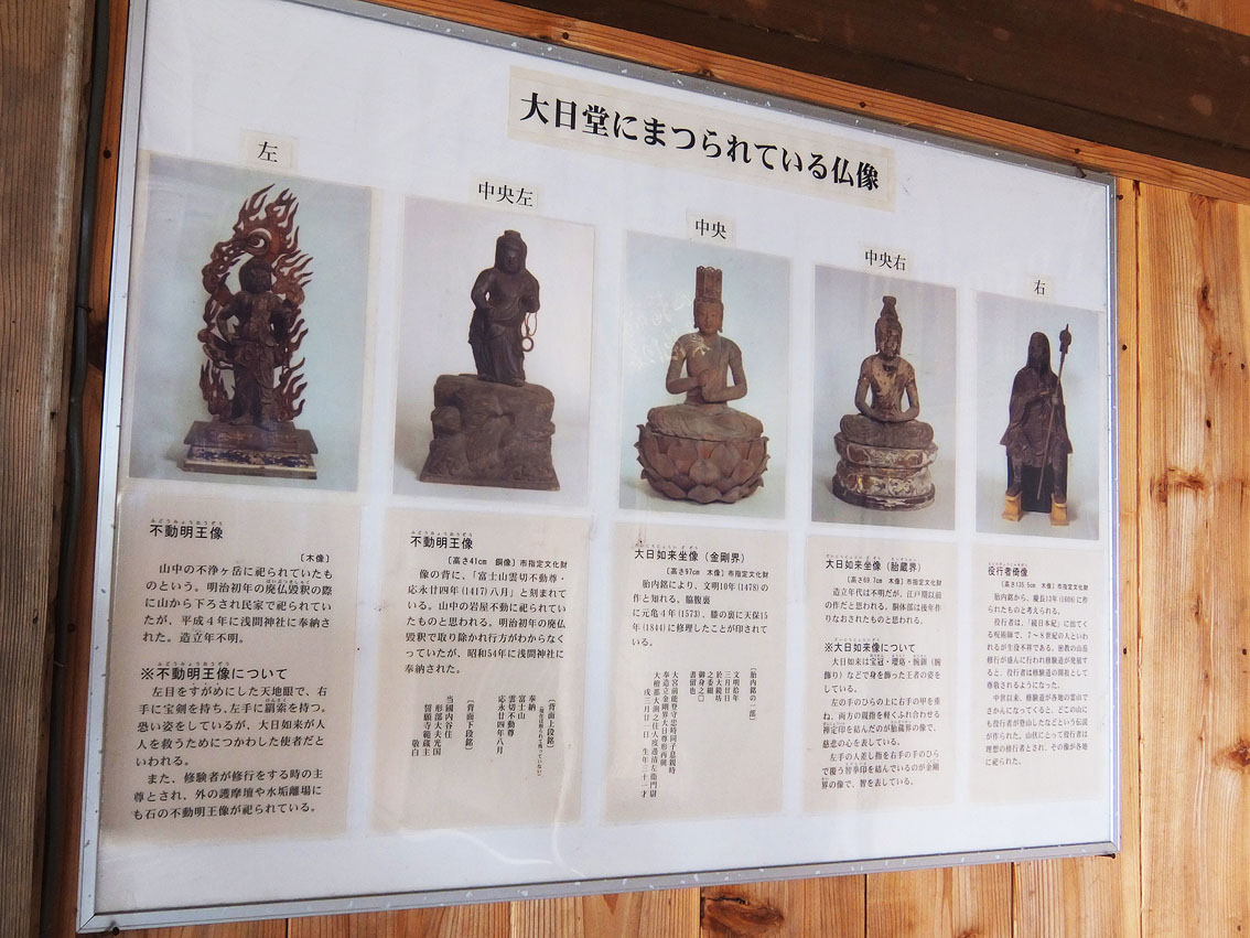 村山浅間神社にて。 土日や祝日には、地元ボランティアのガイドさんが案内してくれます。 これはラッキー! ガイドさんと一緒に興法寺大日堂に上がることができました。 大日堂には、いくつもの仏像が安置されています。 大日如来像、不動明王像、役行者像のほか、 前鬼もしくは後鬼(前鬼と後鬼は役行者に従った夫婦の鬼です)、 それに、猿らしき2体も! 神仏分離令の際、多くの仏像が破棄されたり富士山の火口に投げ込まれましたが、 (東京の富士塚でも、しばしば頭のない大日如来や猿像を見かけますね) ここにある仏像は、修験者たちによって密かに富士山から降ろられたそうです。 受難を逃れた仏像たちは、「下山仏」と呼ばれています。 「高砂酒造にもかくまった仏像がありますよ」とガイドさん。 「えー!? 昨日高砂さんに行ったのにー。知りませんでした」 高砂酒造とは、富士山本宮浅間大社で見た奉納酒「高砂」の蔵元です。 予約をすれば、蔵の中の下山仏を拝観することができます。 「中央の大日如来様は、とてもいいお顔をしていますよ。近寄って見てください」 と、ガイドさんが手前の台をずらしてくれました。 文明10年(1478年)の大日如来坐像は、気品ある表情もさることながら、 宝冠など細部が素晴らしく、蓮華坐も高くて立派でした。 その他、ガイドさんからはたーくさんの貴重な情報を頂戴しましたが、 ここでは割愛させていただきますね。 大日堂の隣には、水垢離場と護摩壇があります。 つづく。。。 Facebook あり〼