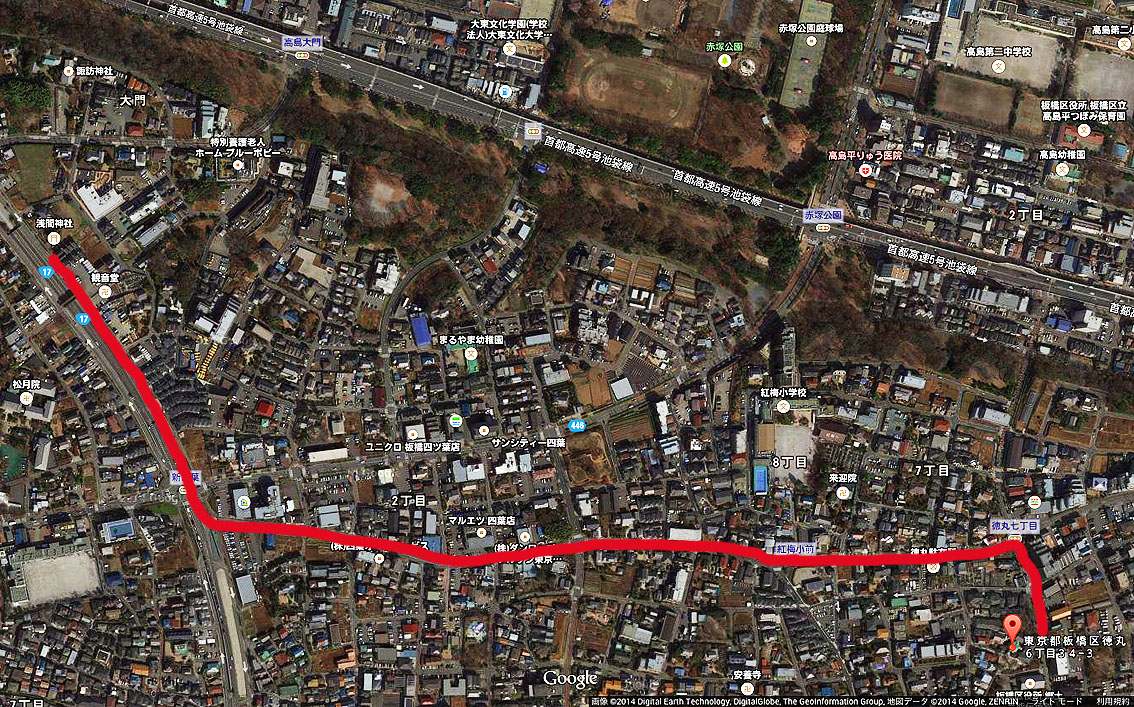 下赤塚富士のある浅間神社から、崖線に平行して、 東に向かうと、南側にも崖線が出てきます。 北側の崖線は、北にえぐれた崖ですが、 南側の崖線は、南にえぐれています。 つまり、ここだけ台地になっているわけです。 台地は、南北に幅200〜300mくらいあり、 徳丸7丁目がすっぽり入っています。 2本の崖線に挟まれ、台地の南端にあるのが北野神社です。 (3つ前の記事のカラーマップの真ん中あたり) ここに「徳丸富士」があります。 夕暮れ迫る頃、微小な塚が印象的な姿を見せてくれました。 すでに暗くなり始めた神社境内。 頂上の石祠だけ西日を受けて光っていました。 唯一の碑、小御嶽石尊大権現が立派です。 塚もかつて大きかっただったろうと推測されます。 なぜか上部断面のみに赤く塗られた形跡あり。 厚塗りのベンガラかもしれない。 ちなみに、徳丸あたりはお宝地形。 起伏ありスリバチあり、階段マニアにもたまりませ〜ん。 Facebook あり〼