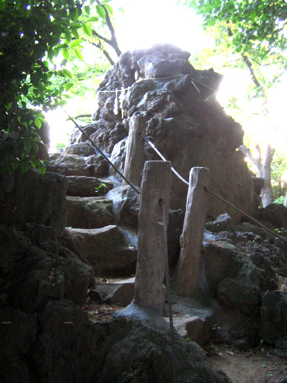 「銀明水」のせいで、南斜面が登山道だった説はひとまず保留。 でも、途中から右へまわりこんだ道はお中道となり、東側から 頂上へと石段がつけられています。それがこれ。 研究者にはこちらが正面という人がいるようですが、はたして? でも、この道もどうもうさんくさいのです。石段が新しすぎ。 私はやっぱり南側正面説でいこう〜!(笑) まあ、しょせん人工の富士山だから、旧道でも新道でもあまり 意味はないんですけどね。ほとんどの富士塚はいろんな石碑を 寄せ集めているんだし、いちいちツッコミ入れなくてもいいんです。 それでも、推理したり検証したりするのは、過去の人たちがどんな 想いで登ったか……想像するので楽しいわけです。 現代には現代の登り方がありますから、それを理解しつつ登る。 でもできるだけ、自分のカンで地面から嗅ぎとってみるのが 富士塚に登る醍醐味かと思います。 だんだんマニアックになっていくな〜私。