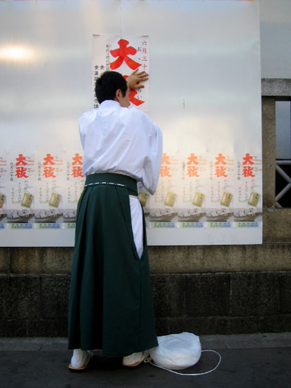 またまたやって来ました。気になって。神社の外では、若い神主さんが、「天王祭」のポスターを「大祓い」のものに替えていました。