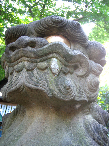 まず、白山神社本殿を護るコマイヌに挨拶。なんだか気合いの入った「阿吽」の「吽」!