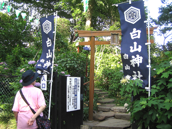 社務所の裏に金網で囲まれた築山があります。毎年1回、紫陽花まつり(今年は6月9日〜17日)の9am〜5pm、限られた期間のみオープンします。紫陽花は神社境内でたくさん見ることができますが、やはり紫陽花で飾られたこの山を登るのが人気ですから、ツアーの観光客もやって来ます。しかし、訪れる人のだれがこの築山が「富士塚」だと知っていようか。。。