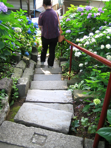 登山道と違ってこちらの石段は、年代物の石が使われていました。塚の築造は江戸時代だったと思われますが、富士塚の研究者も「昭和初期に山が荒廃した」と書いてあるくらい、一度は塚はなくなったようです。でもおそらく(神社の主旨か何かの理由で)その後富士塚としてでなく、紫陽花を楽しむための築山として、復活させたのだと思います。なぜなら。。。