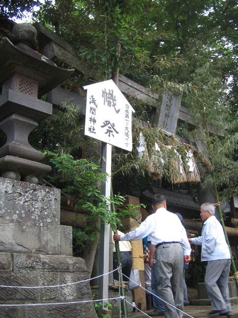 その場にいた人の中に、おそらく私くらいしかないでしょう。「せんげんさん、のぼりませうね」と声かけあって石段に足をかける人たち。通常は鳥居のまわりにこんな材木はないでしょうが、今日は幟立てに使う綱を通す滑車を設置するため、このようになってました。くぐって登ります。