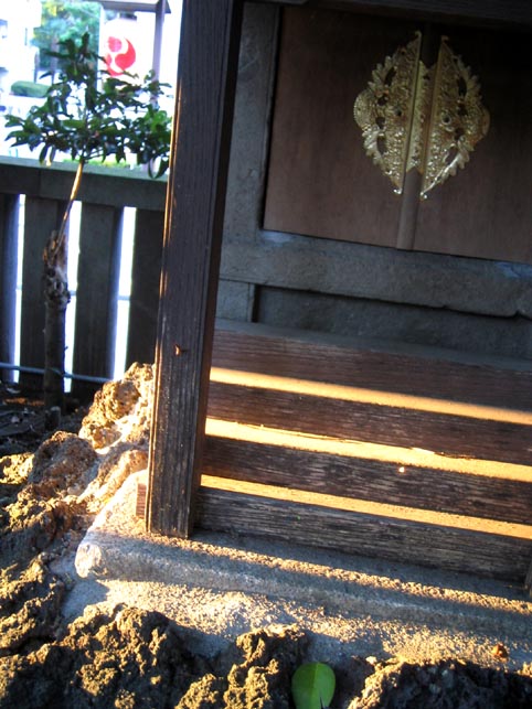 日中でも日射しが当たらないこの富士塚に、西日が鮮やかにさすのを少し感動的な想いで眺めました。先ほど、NHKの新番組「にっぽん 心の仏像]を見ましたが、その中で紹介されていた兵庫県浄土寺の、西側からお堂に入る夕日を思い出しました。東を向いた阿弥陀如来が西日を背後に浴びた姿は、後光を放ったかのようで、さながら西方浄土。西日にはやはりあっちの世界の入り口へいざなう、特別なものを含んでいるようですね。。。