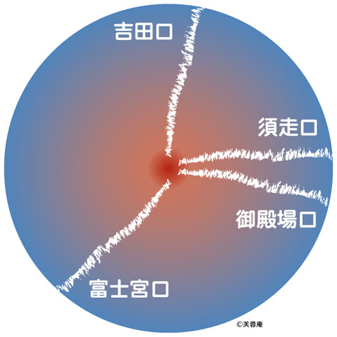 大まかな位置をふまえておくとわかりやすいので、作ってみました。吉田口は山梨県ですが、他はすべて静岡県です。