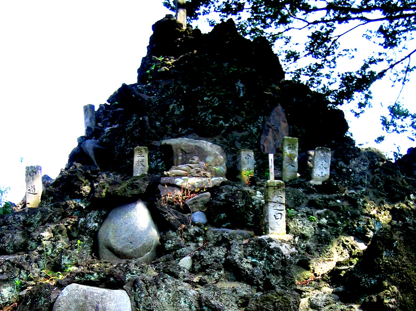 下の「須走」はやはりナゾのまま。なぜなら、吉田口の登山道から反時計まわりに約30度移動すると、こんな石碑たちが目に入ります。