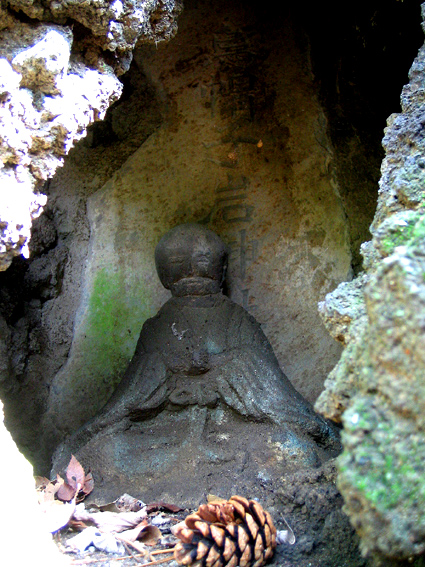 洞窟の中は……このブログで何度も登場している、富士講の粗「食行身禄」でした。 始祖ではないけれど、富士講が大きく広まったのは食行身禄のおかげです。(富士塚は食行身禄の直系の弟子が身禄の没後に築造した身禄山とも言えるものなのです) 食行身禄は、記録上初めての富士山女人登頂を行ったその人です。娘の花さんも父の意志を継いで教祖になりました。 私は富士講員ではありませんが、そういう意味でも、フェミニスト身禄をリスペクトしています。 ちなみに、伊藤伊兵衛が食行身禄と名のったのはもちろん彌勒菩薩からです。 もひとつ。沖縄の「みるく神」も彌勒です。 ★身禄像の背後に「烏帽子岩神社」の文字が見えます。現在も富士山の7合5勺に立派な神社があります。身禄が入定したところです。