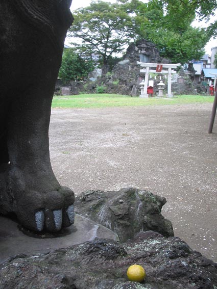 誰が置いたか、狛犬におすそ分け。遠景もサマになるお気に入りの富士塚であります。
