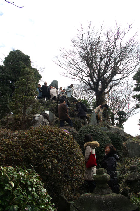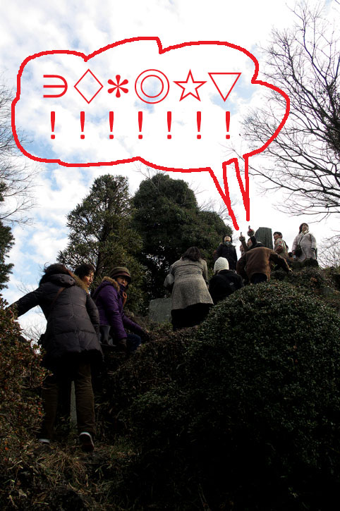 ******* 「流山富士」登拝 正面の北口一合目の石を簡単に説明したところで予定変更。後は省略することにしました。 とにかく登って味わってもらうのがいちばんです。「皆が乗っても大丈夫ですか?」の声にヘイキヘイキと答え、私は登山者で鈴なりの富士塚を下から眺めました。いやあイイ感じ♪ この流山富士は、私が登った富士塚の中で最も勾配がきつく、昨年夏に来た時は草の繁茂に閉口したほどでした。足元が見えないと滑落の危険があったからです。 でも今回は、予想通り、登山には適していた。前回草で隠れていた登山道がちゃんと確認でき、石碑も表れていました。それにしても、かなり急だなぁ。 「え?」「何か見えるの?」