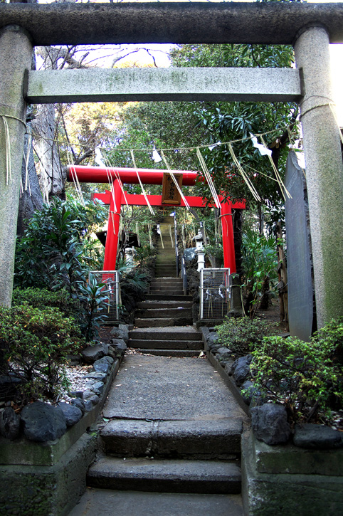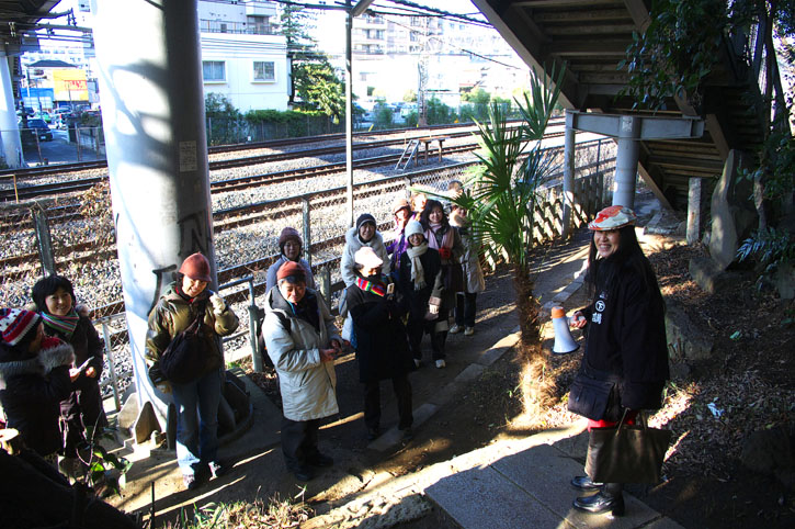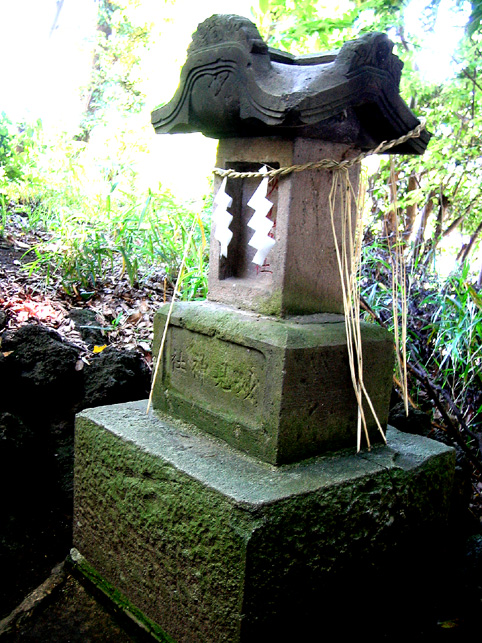 ******* 迷子になりながら? 参加者の皆さんは、富士塚ビギナーばかりではありません。マニアの方や個別に探索したい方もいましたので、一旦山頂にて解散し自由時間を取りました。 私が連れ回した人達は、二重三重に入り組む登山道を歩くことになりました。私もちょっと迷って同じ道に出たりしましたが(笑)。。。 小御嶽神社(画像をコントラスト効かせてみたら、あらら、左上に「ハート」の空が!)を拝んだり、 富士塚には珍しい妙見(みょうげん)神社の前を通ったり、 皆でおかしがっているのは。。。 「実はこの陸橋の下が登山道の始まりなんです」 「ありゃ。これは『トマソン』に投稿せねば!」 橋の上に金山神社が鎮座しとります。 てなことで笑いながら歩いていたら、集合時間となりました。あれ?人数がひとり……足りない?多い? どうも狛犬も頭数に入れてたみたい。点呼を取ったら数が合いました。では、次へ向かって出発! 来た道と違うルートを取り、富士塚の南西斜面を臨みます。ああ、ここも建築が始まってました。流山富士でもそうでしたが、ちょっと見ないうちに富士塚の隣接地はこうして富士塚の形が見えにくくなっていきます。私が「富士塚が保存されても景観は保存が難しいから、なるべく早く見に行ってほしい」と言う理由がこれです。悲しい〜。 富士塚のあった根本城跡の裾には「岩山稲荷」もあります。 「これも富士塚?」と参加者の方たち。 ほら、小山を見ると富士塚に見えてきたでしょう?(笑)