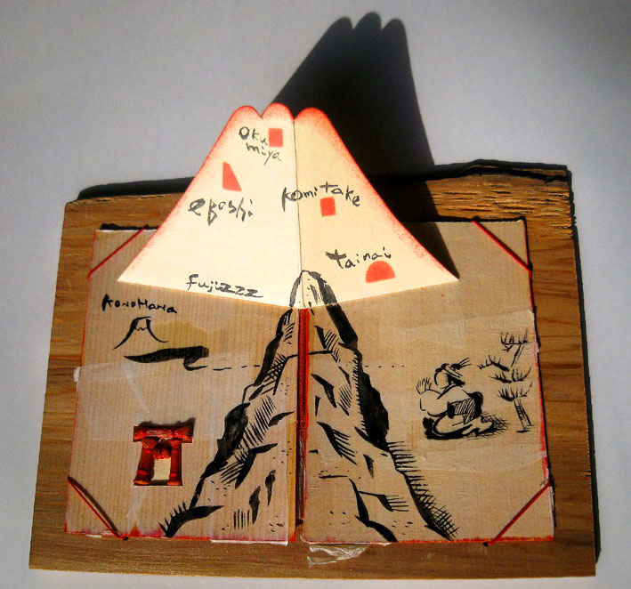 飛び出す富士塚。祈る女性。傍らにはRED BONE-SHRINE。