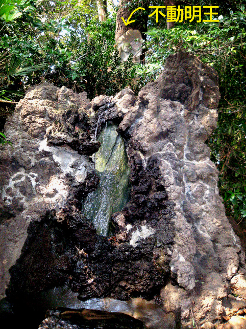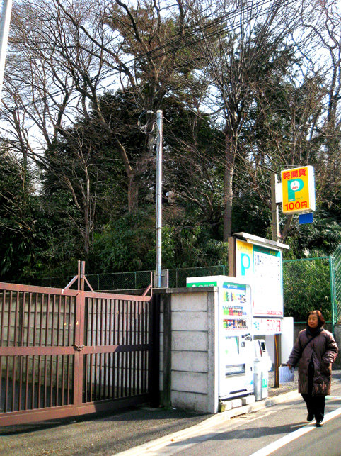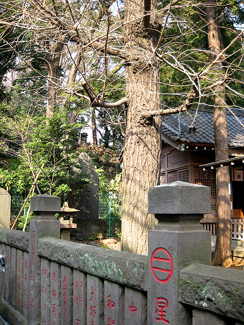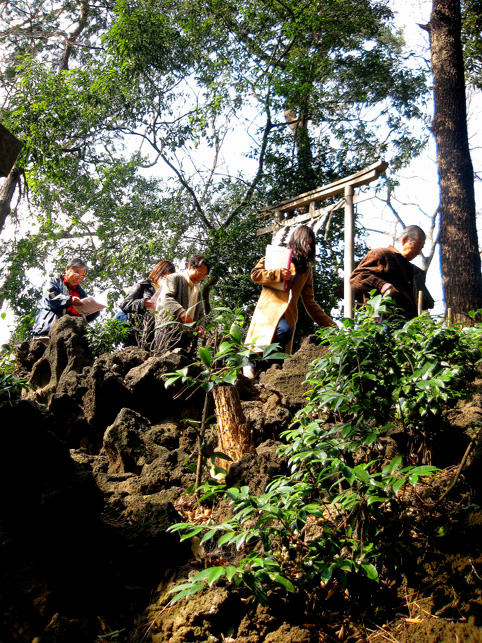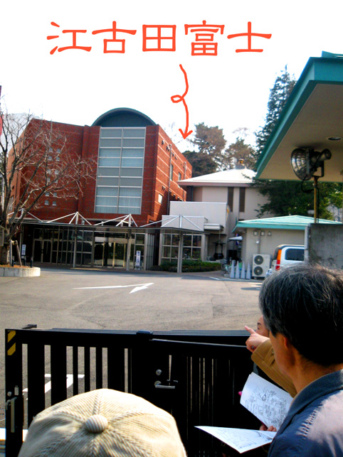 下山いたしましょう。(頂上から煙突が見えます。「浅間湯」とはさすが♪) 後発隊が路上探索から戻ってきたようなので、交代です。我々は境内を出ます。 石柵をまわり、駅を背にして神社の後ろに向かいます。遠くからでも頂上の奥宮がよく見えます。高さ8mもの大きな富士塚はかなり立派です。古墳を利用した塚であります。形は違いますが、駒込富士のようにね。 裏側にやって来ました。もうひとつの班がちょうど頂上に登ったようです。左(富士塚の真北)にある駐車場あたりは昔、池があって、そこにあの大山不動尊座像が祀られていたのです。 一行はもう少し神社から離れてみます。明治&大正時代のここ一帯の略図を眺めながら、Kさんの説明を受けました。現在江古田斎場になっている建物の向こう側に富士塚が見えます。おお!建物と富士塚の間あたりに池があった。おお!そして自分達が立っているあたりが川でした。おお!(たぶん現在は地下を流れてます)ふむふむ。石神井川の支流ね。そうですか。富士登山の前のみそぎは近所の川でやっていたのですかー。面白い。実に面白い!