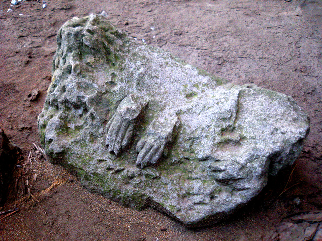 前回訪れた時にツアー参加者の皆様に紹介した猿(の足。記事内3つめの写真)の対を発見したとの連絡を、友人から受け早速確かめに行ったのでした。どこどこどこ??? まず、右側の猿足の位置を確認。すると、その向こう側、松の木の根元に…… あった! 間違いなく対の猿の足です。こちらは足首からもがれていました。 ↓鎮座していた台座はあるものの、 やはり姿がないのは悲しいですね。↓台座の位置は湯殿山の碑のすぐ後です。 猿像まで奉納した講だからかなり立派だったと思われます。社務所が閉まっていたので尋ねる人もなく、いろいろ想像をめぐらせながら境内を出ました。 松戸市で行った富士塚はこれで4つ。あと5つあります。まあ、少しずつ♪少しずつ♪