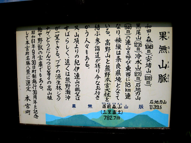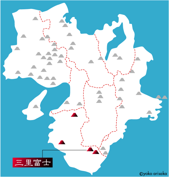 ▲▲▲▲▲▲【三里富士】▲▲▲▲▲▲ 熊野に行っても忘れちゃあいません。富士の山! ここで会える富士山はこちら。 【三里富士】と言われる百前森山(ひゃくぜんもりやま)、標高782.7mの端正な姿です。 果無(はてなし)山脈が横たわり、山なみの美しさを目で味わっているとひょっこり語りかけてくる、そんなたたずまいの山であります。歩きながら「あの山、な〜んか富士山ぽいな」と思っていたところ小松さんに教えてもらったのでその嬉しさったらありません。きゃあきゃあ言いながらたくさん写真を撮りました。これはちょっと高い位置からの。 ちなみに近畿地方全体に○○富士はこんなにあります。和歌山県には4つだけ。実は、あったことだけでも驚きでした。