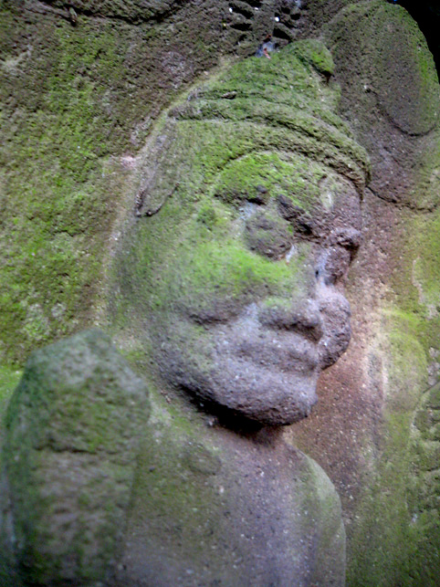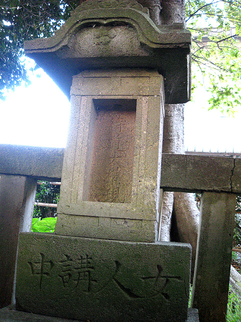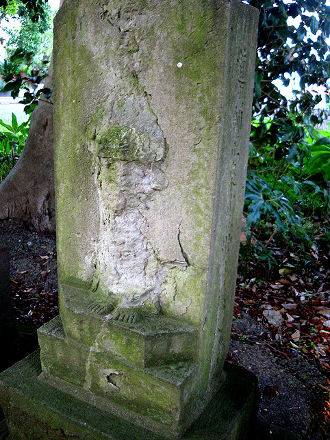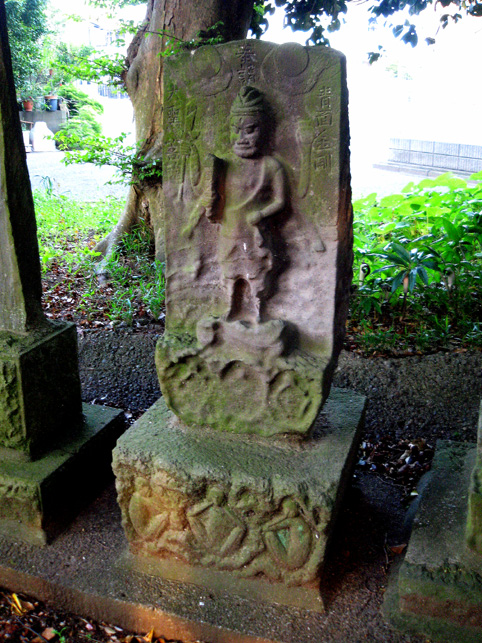 とでも言い出しそうなこの表情。 青面(しょうめん)金剛には本当によく出くわします。富士塚の麓を守っているかのように出会います。でもあまり怖い表情のはいないです♪ どうもひょうきんだと思ってよく見ると下半分がとけている! 小さくなった足で餓鬼なんか踏んづけてらんないぞ、と思ったら餓鬼がとけている。その下の見ザル聞カザル言ワザルも消えている。なんだこれー?脆い砂岩の石像が土に埋まって溶けたのか?しかたないから新しい土台にのせたのか? 溶けたと言えば、 こちらも激しい。溶けたというより剥落か削られたようですが。でも美しい。裸足のディテールが何とも言えずイイ!菩薩か観音か?まあ、とにかく古い古い。すべて江戸時代のもの。 さあ、出ようとした時、また「女人講」の碑が。こちらは特別大切にされて、外柵に守られていました。「待道大権現」と中央に彫られています。おお、これは流山で見た「待道講」ではないですかー! 「待道講=まちどうこう」は、我孫子市の岡発戸(おかほっと)にある待道神社が発祥の地……とのことだから、それってそれって!このへんじゃあ??? まあ、とにかく。。。ここを出ます。 ステキなGATEをくぐって。