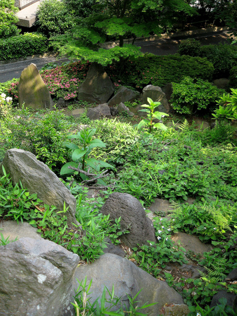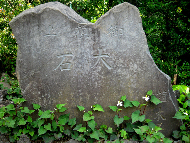 登山道は3本。途中で二股になる道もあるので、頂上へ上がるのは4本になります。その中でも、草むらに隠れて先がわからなくなりそうな中央道がなかなかです。ボク石が足場にたっぷりあるし、こそっと合目石が潜んでいたりする。絶壁のように連らなる石碑群の隙間を行き、えいっと頂上に足をかけると、 わりと広い、平坦な頂き。新しめの奥宮などなど。 頂上だという証にこんな石版も。植木職人の奉納。 ↑こちらは左側からの登山道。右側からの道は玉石の階段が続きます↑ と、うろうろしていたら、いつのまにか猫がやってきました。 そうだ!せっかくだから、猫の目線になって再度登山してみます! 頂上から見おろすとこんな↓ やはり緑の濃い塚はいいです。