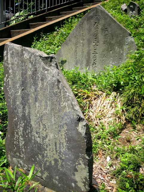 石段にはさまれた位置に石碑。外の斜面に祠。