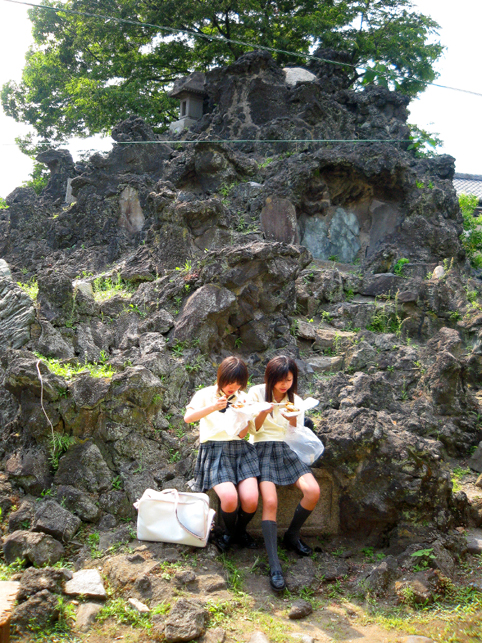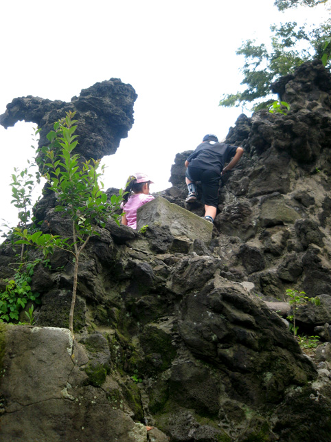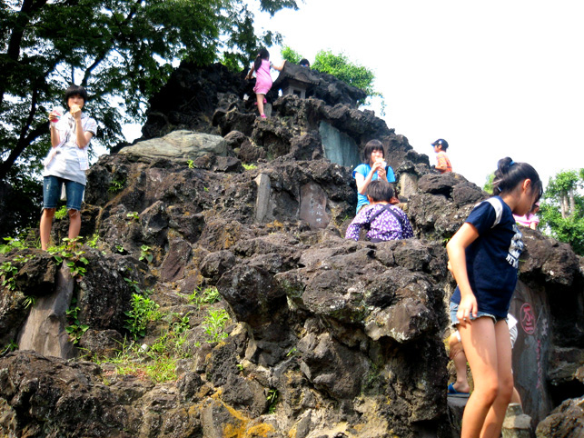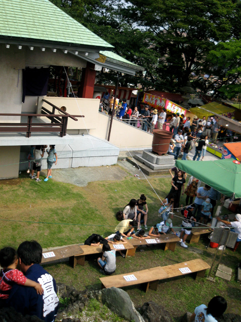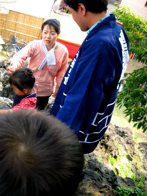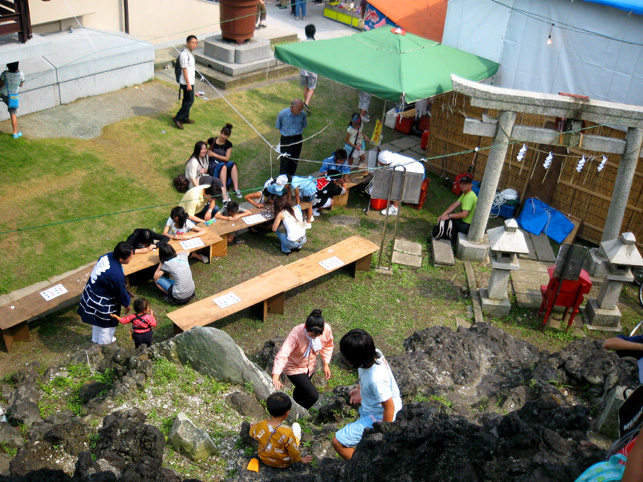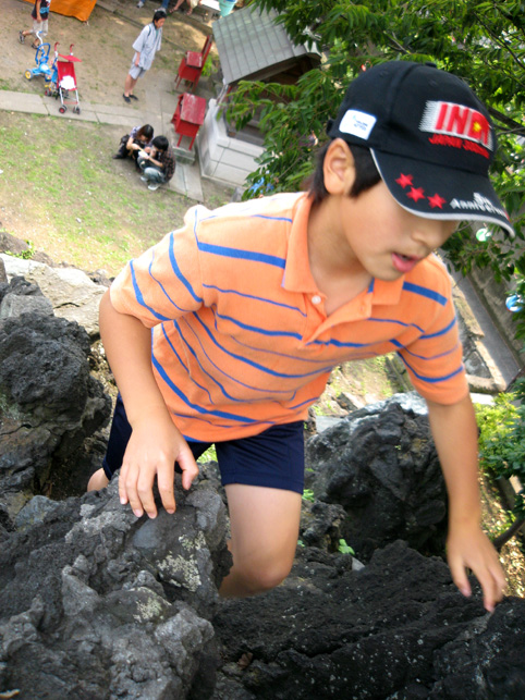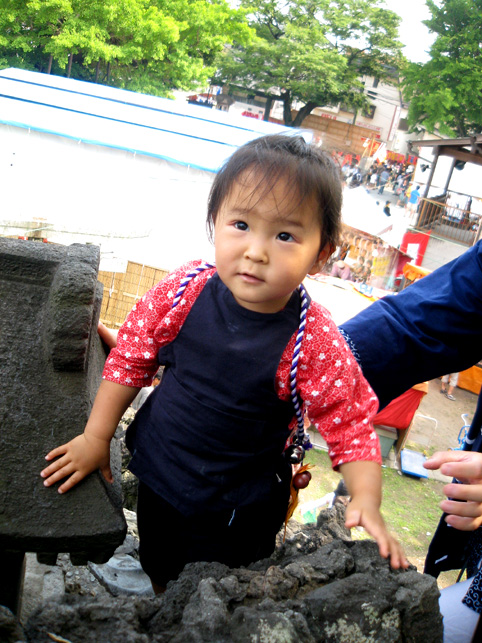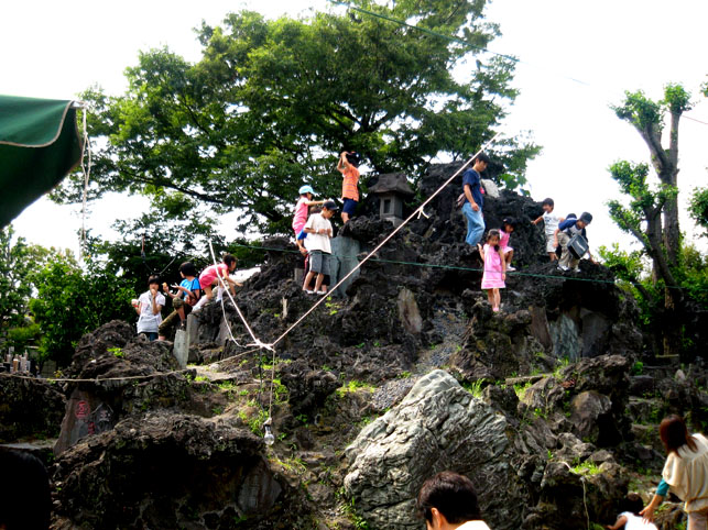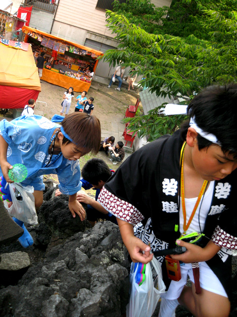 あらら、遠慮しないで好きな岩に腰掛けてタコヤキをお食べなさいな。 お祭りだもの。 てなわけで、友人と私は一気に登頂!普段は遠慮してあまり登りませんが、この時ばかりはといい眺めを味わいます。そして下界を見下ろすと、 麓には、富士塚にわき目もふらず、昔懐かしいカタヌキに夢中の人々。でも、大人ふたりが頂上に立つと目立つのでしょうか。続々と子供たちが登って来ました。ふふ。これでいいのだ。 小さい子にはオトナがついて♪ 参拝者も屋台もよ〜く見えます。 天狗のそばもゆったりスペース。 (かつてあったろう小御嶽神社の祠の跡でしょう) 下山して裏にまわってみたら、勇ましい兄妹の姿。う〜ん。いいなあ。 気づくと猫実富士は鈴なりの人でした(笑)。