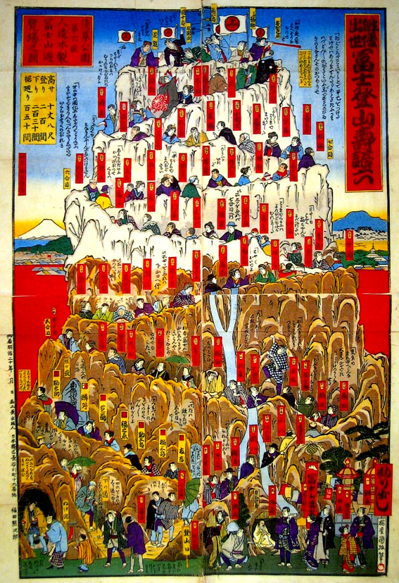 富士塚か〜???かと思いきや、実は、木製の富士山のハリボテです。 明治17年(1884)、浅草の浅草寺の境内に浅草公園ができ、 その10年後、新しい興行地が造成されました。 翌年には、江戸時代から見せ物興行をやっていた「花やしき」が施設を つくり開園。そしてその2年後、「人造富士山」が完成されました! 大盛り上がりになった凌雲閣(通称・浅草十二階)はその3年後ですから、 人々の遊興欲(?)が一気に登り詰めた頃でしょうね。 まあ、関東大震災まで。。。 さて、この絵は「出世すごろく」です。 正確には「俳優出世富士登山寿語六」。 浅草の「木製人造富士山」を使って描かれた人気(歌舞伎)俳優の 番付表みたいなもんですかね〜。 実際サイコロを振って遊ぶのでしょうけど、右下がふりだし。 ナンバリングしながら、その高さに合わせて俳優の格づけをしています。 頂上には「團十郎」「左團次」「福助」らの名前が、読みとれますが、 ふもとには身禄行者がいたり、ぬけ穴があったりして楽しい。 左遠方から白富士に見守られているのが微笑ましいですね。。。 【明治20年、梅堂国政の筆による】 ああ、この馬鹿馬鹿しさが楽しくてたまりませーん。ハリボテがですよ!