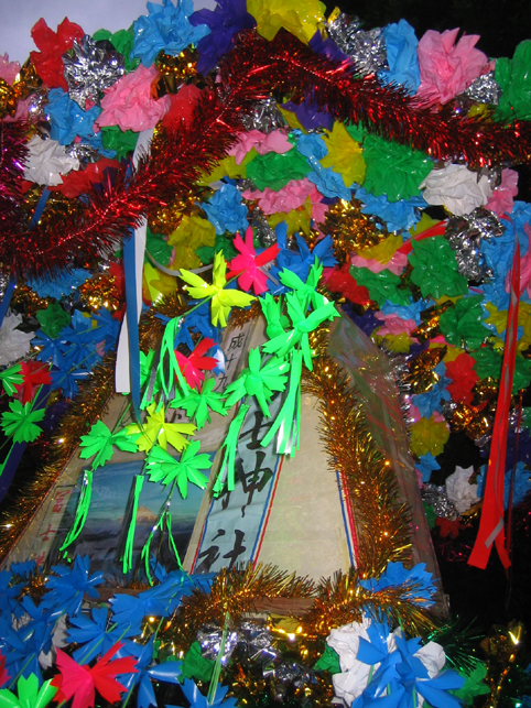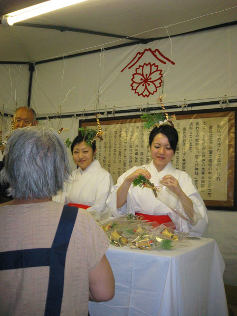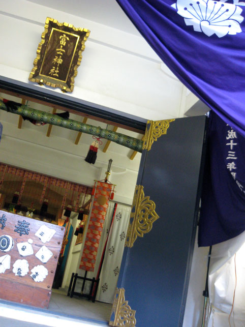 時間がたってしまいましたが、お山開きシリーズのつづき。 JR駒込駅の脇、本郷通りは線路をまたいで高架になっています。その橋にはちょっと粋なデザインが♪ これから富士神社へ向かいます。 駒込のお富士さんのお祭りは、6月30日、7月1日、7月2日の3日間あります。30日の早い時間に「万灯祭り」で町内を歩き、お山開きの告知をされました。(その時の万灯は頂上に設置)。天祖神社から宮司が来ての神事は1日朝。 これは30日の夕刻。露店の準備が出来て人が押し寄せる直前の図。正面の奥をよく見ると、富士さんの石段と頂上の富士神社社殿が写っています。 賑わいを見せる夜はここにたどり着くのにも少々時間がかかりますが、明るいうちは空いています。 頂上でも同じものを売っていますが、下の社務所には氏子(講中も含む)の方たちが待機していました。お客の少ない時間はまだお顔にうっすら緊張感がありますが、 2日後の最終日に再び訪れたら、こんな表情。ジョークも飛ばして楽しそうでした。「名物の落雁、買って行きなよ。昨日買ったって?2袋目でもいいじゃないか。笑」 私もノリで2袋目買っちゃいました。ちなみに去年まで雪のかぶった姿がまざっていましたが、今年はナシ。地球温暖化に合わせてではないでしょうが(苦笑)。。。氏子の方がすまなそうにおっしゃってました。この落雁は、元々町内の和菓子屋さんから売られていたけれど、お店をたたむことになったので、お祭りの際に神社から売り出すことにしたそうです。 落雁を出したらやはりこれも出さないとね。十条富士でもお馴染みの「麦藁蛇」。こちらでは「神龍」と呼びます。材料といい作り方といい、大きさは若干違いますが十条と駒込の麦藁蛇はよく似ています。実は両方とも昔から北区西ヶ原のK家で作られているそうです。江戸時代からの伝統です。 「ずいぶんたくさんありますね〜」「私ら頑張ったからね〜♪」「え、皆さんが作ったんですか?」「いや、蛇は出来たのが来てさ、それを枝に刺して仕上げたんだよ」「それはお疲れでしたね!ところで今年はガラスケースに入っている大きな神龍はないのでしょうか?」「ああ、今年は出してないな。それに、売るやつも今年は大きいサイズ(2000円)のはなくて小さいのだけに統一したんだ」「ふむふむ」 その後、講元(左からお二人目)からいろいろお話もうかがえました。「この神社の裏は昔、茄子畑だった」こと「境内の地下に防空壕が作られ、その時に掘った土をお山に加えた」こと「講員は約35名」などなどなど。。。(講員ってもしかしたら他の氏子さんもカウント?)と思ったけど、宮元講社→丸瀧講のお話になったので。。。私の結論は。。。「講は講です」 石段脇にある「下浅間社」に寄ると、 「昔はこの中でお焚き上げをしていました。講の名前は廿三夜講です」とおっしゃる方が。 ここには古い額がわんさか。「上がって撮っていいですよ」のお言葉に甘え、じかに見させていただきました。表記もいろいろ。「富士社」「富士神社」「富士大権現」とありますが、特に古い「富士大権現」をアップ。 最後にもう一度、登って一巡しました。山頂社殿脇で、ステキな表情に会えたのでこちらもアップ。 気づくと空はこんなに暮れてきました。ぼんやりお山の姿が浮かぶ。もう8時近いというのにこれからどんどん人が増えます。やっぱり縁日は夜が似合いますな♪ では、次回は「鎮火祭」に参りまする。