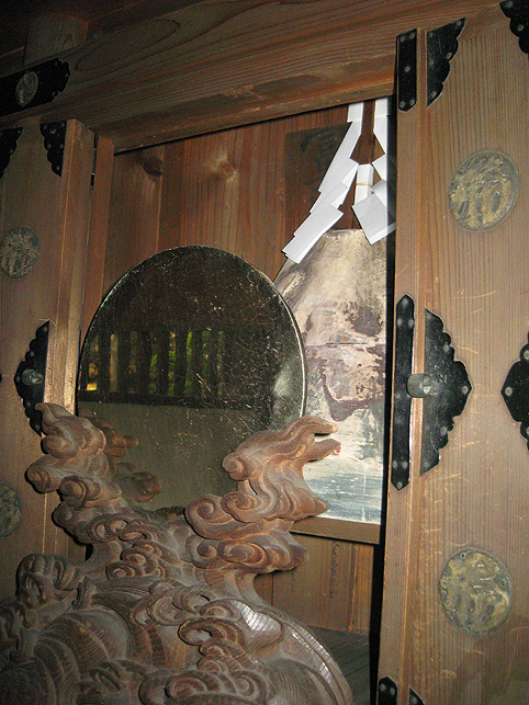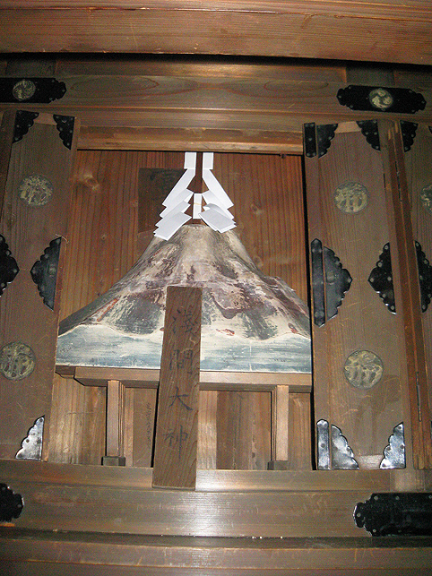 お山開きの儀式はとどこおりなく終わりました。講の方々は素足を丁寧に拭いて、社殿内を片付けにかかります。お猿さんに「また来年ね〜」と語りかけながら。 浅間神社の本殿に祀られていた「御神体」を拝ませていただきました。 儀礼の際には暗くて見えなかったけれど、こんなお姿でした。手前の御神鏡に外の品川富士が映っているのが見えますか? 鏡をよけたところ、正面からはこのとおり。 「木製ですね?」「さわっていいですよ」 一瞬触れさせていただいただけですが、すぐわかりました。 たぶんですが、桜とかの木の土台に、層の厚い胡粉地で滑らかに盛り上げ、着彩したものと思われます。その優美なこと!右側中腹に小さな段があり。小御嶽か宝永山もしれません。高さは30cm足らず。幅40cm以上。 「頂上には火口(窪み)があるんですよ」「ひぇ〜そうなんですか♪」 その中に御幣を立ててあります。裏面には「蓬莱山」と書かれているとか。蓬莱山、つまり富士山のことですね。