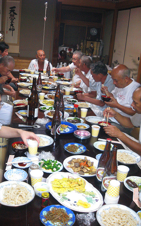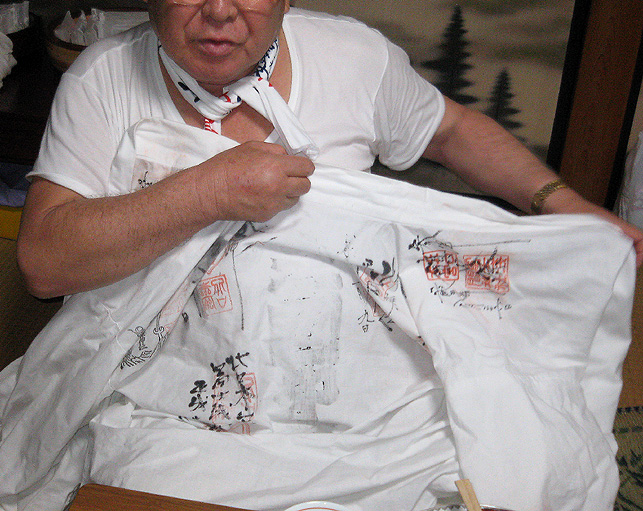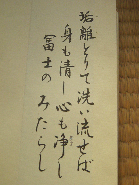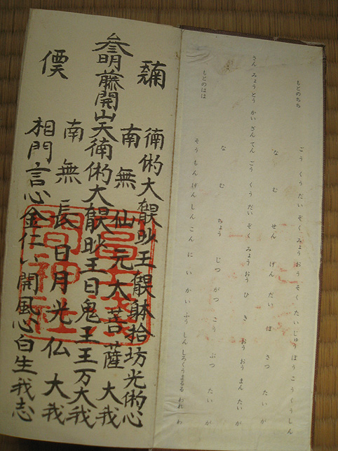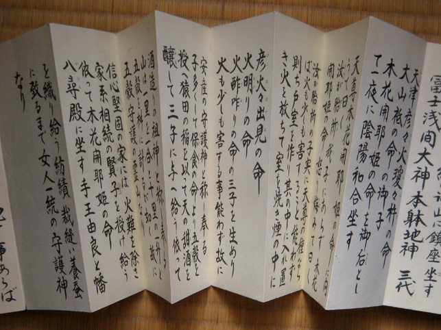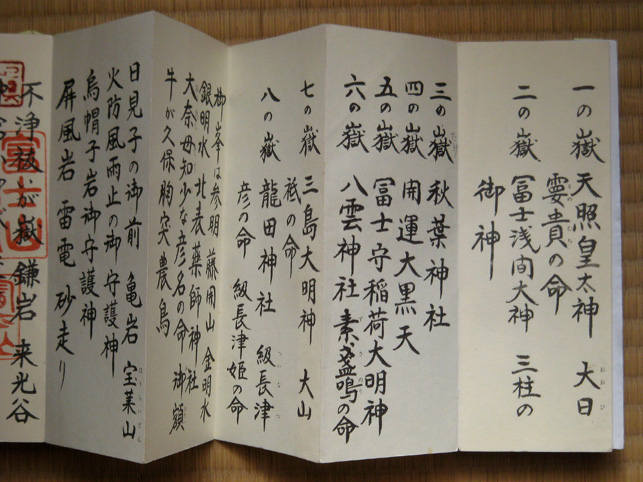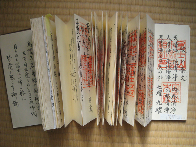 100年に一度しか咲かないという、龍舌蘭が咲く先達のお宅にお邪魔しました。龍舌蘭はビックリするほど背が高く、先端は、夜空に隠れて見えました。 直会(なおらい)にお邪魔させていただきました。昔の先達の仰天話とか、出て来て面白かった。「JN先達は裸足で登ったって言われてるけど、ホントかね〜♪」なんて言いながら。 お野菜の美味しいことといったらありません。おうどんも腰があってたまりません。煮物もテンプラも格別でした。御馳走様でした! ちょっとトボケたOさんが、行衣の「朱印」を見せてくれながら、「はい。一印につき300円(撮影料)だよ」(笑) Mさんがお伝え本の中を見せてくれました。 中里富士の頂上に掛かっていた掛軸、「おみぬき」には、こんな文字が書かれています。これは、お伝え本の1ページ目。作字が多いので、ふりがながふってあります。富士講にとっていちばん大事な題目です。 北口浅間神社や小御嶽神社や頂上の奥宮でいただいた「朱印」のページは、朱肉の油のいい香りが残っています。「たくさん捺してありますねー!」「いや〜あんまり捺すと読めなくなっちゃうんだけどね〜」(笑) 富士山の頂上は8つの峰があり、8神がいるのです。仏教だと8枚の蓮華の花弁に9仏(8仏+真ん中に1仏)。 コノハナさまのことが書いてある。真ん中あたりに、産んだ3人の神々。海彦、山彦とあと誰だっけ? で、どんなことをお祈りするかっていうと、「家内安全とかね」 ああ、清々しいですね〜。 皆様、本当にありがとうございました。お世話になりました。 次は冬至の晩の「星祭り」ですね。ロマンチックだな〜♪皆さんお元気で! M様、またご連絡いたします。