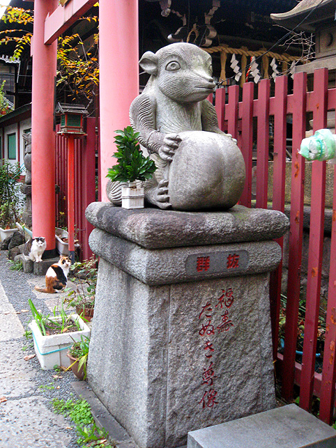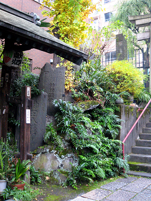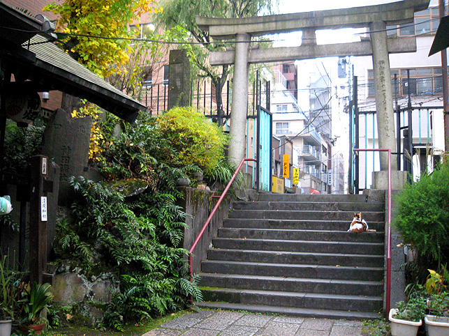 ここに富士塚があることを知らない人は多い。 真っ先に目に入るこの狸像が異彩を放っているからでしょう。 猫も、どことなくコイツにだけは一目置いているみたいです。 それでも手下のつもりだけど。 境内には、神楽殿や本殿の他に、いくつもの小さな神社があります。 でも、それらは省略し。。。こちらが手水舎。右手前が富士塚です。 石段を降りてふり返り、富士塚を見たところ。 富士塚というか、塚の残骸というか。まあ、カタチはどうあれこの石段の 左側、隅っこが富士塚です。 猫は気まぐれに歩き回り、すでに石段に陣取って毛づくろいをしている。 通りから、鳥居をくぐって人が続々とやって来ます。 まるでここに吸い込まれるように。 ほとんどが、神楽殿横にある灰皿で喫煙するビジネスピーポーです。 最初、休憩時間にお参りしに来てるのかと思ったけど、そうではなかった。 まして富士塚に興味ある人はいないようです。 彼らは、タバコ片手に携帯チェック。 でなければ、お参りに余念のない少女や、富士塚に見入る私を 珍しそうに見ているだけ。 猫たち、狸たち、狐(稲荷神社なので)たち、富士塚、 ビジネススモーカーたち、ひたすらお祈りする少女、 そして私。 これらが、せまい境内に共存するという不可思議さ。 その境内は何でも飲み込む異次元か。(笑) 猫は皆、貫禄ある老猫で、ケンカの証も勲章のようでした。 つづく。
