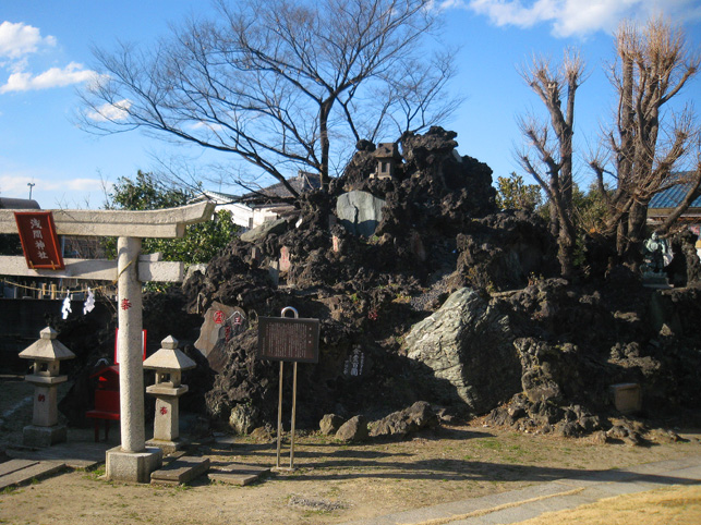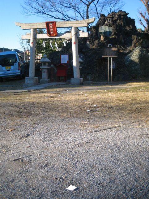 私が住んでる地元で、お世話になっている年配ご夫婦がいます。会えば挨拶をし、たまに立ち話をする程度でしたが、先日、『ご近所富士山の「謎」』を一冊お渡しし、「こんなことをやっているんですよ♪」とお話しました。 すると、「早く言ってくれればよかったのに〜。私たちも富士山大好きだし、浦安にはたくさん富士塚あるしね。あすこの富士塚は昔からなじみですよ。それも書いてくれたの?」 「あすこの富士塚」とは「猫実富士」のこと。残念ながら、最近神社が登山禁止の看板を大きくしたので、ちょっと遠慮して取材を申し込みませんでした。(たいていは、登山禁止の看板があっても子供向けのものなので登ることはできるのですが) 「ホントはすご〜く紹介したかった富士塚だったんですけどね」 「今度はぜったい書いて下さいよ〜。いい富士塚でしょ?」 「ええ。私は大好き!いつか形にしてみますね。神社に相談して」 「でも知ってる?私たちは『てんぐ山』って呼んでたんですよ」 「ああ、よくわかります。あの天狗は存在感ありますよね。昔あの天狗が怖かったって近所のおばさんが言ってました」 (画像の右側には、小御嶽の祠があった形跡があります。石祠は下に下ろされ今は地面の上) 「子供が小さかった頃、しょっちゅうあの富士塚の『砂走り』を滑り降りてはジーパンのお尻に穴をあけて帰ってきたものです」 「へえ〜。そんなことがあったんですか〜♪」と、富士塚談義は大盛り上がりとなりました! この日、氏子の方が新車の御祓いをしてもらったのでしょう。「切麻散米」の白い紙が、春風に舞っていました。 かなり大きな富士塚です。神社の外からも様子がわかります。