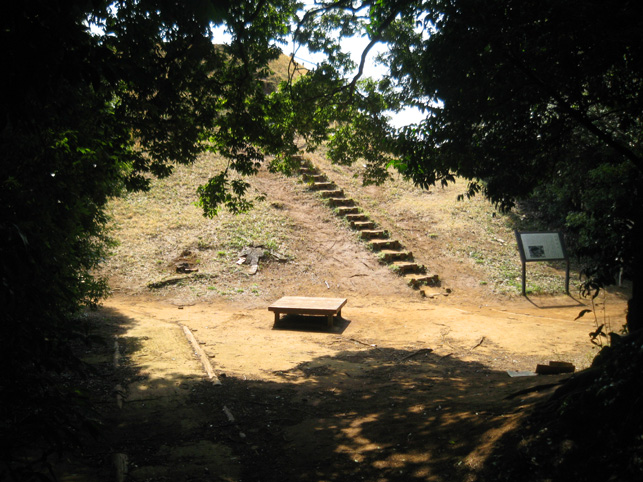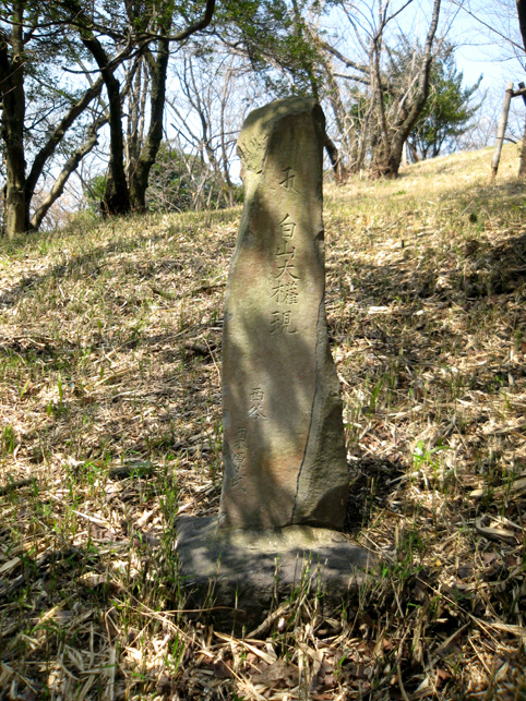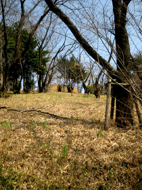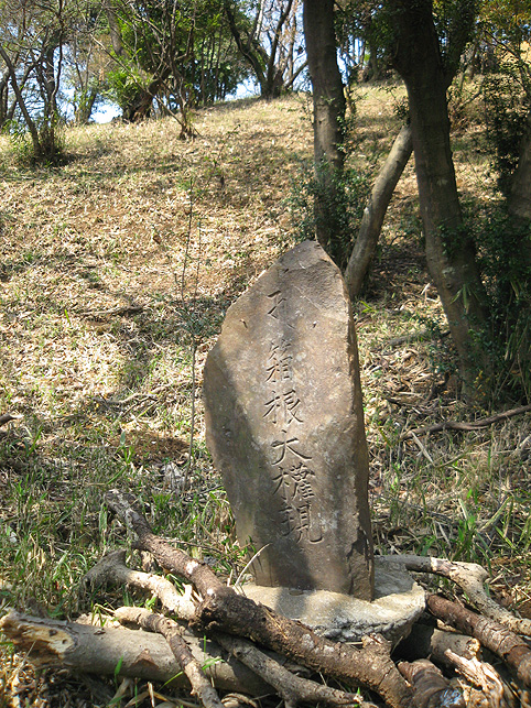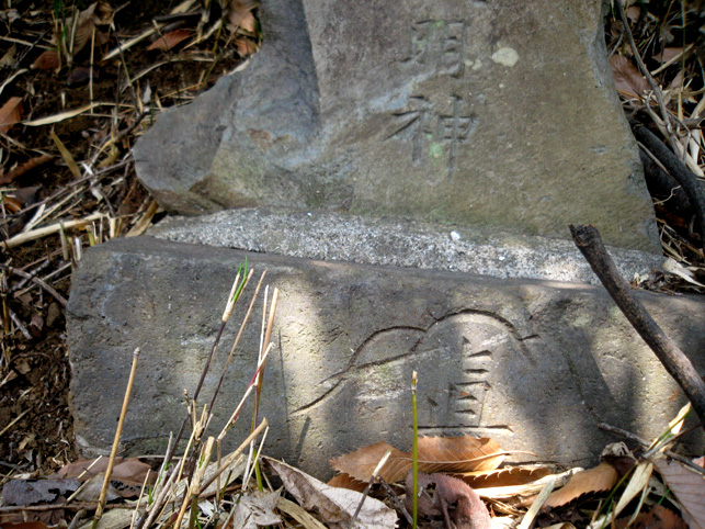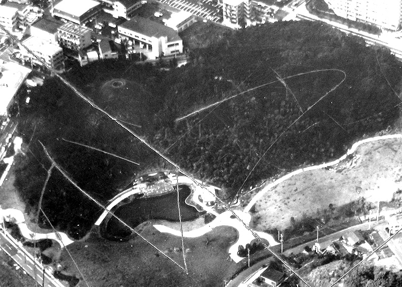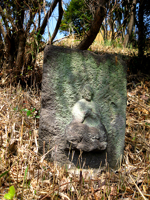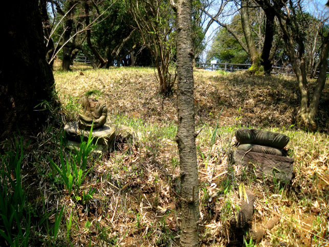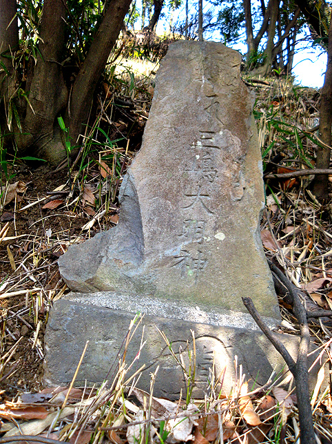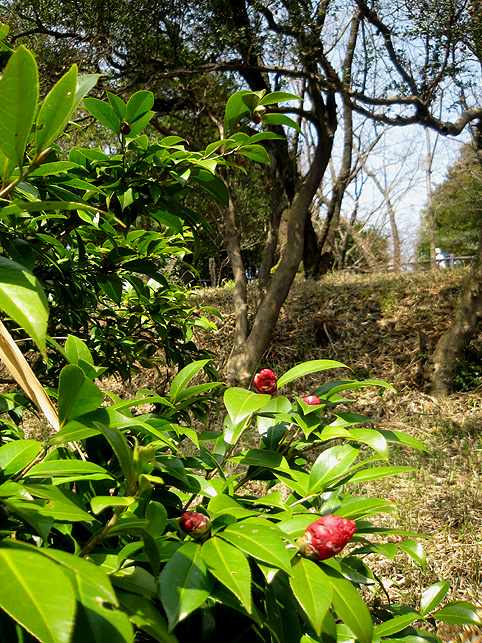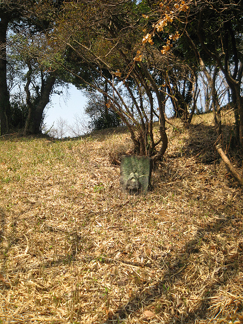 よく見えないようになっていますが、実は、南側の麓から登山道もついています。かなりの急勾配なので、散歩で訪れる一般の方は登らないで下さいね。 斜面には、木の根元に仏像や石碑が置かれているのがわかります。 いくつかの仏像と違って、これは和服を着ています。身禄様ではないでしょうか。 横浜の富士塚に多い、○○大権現の石碑。かなりの数があります。 こちらは、台座に山真講の文字です。頂上の火口の中にあった山真講のものです。この富士塚を造った富士講と言われています。 胎内も造られていた山田富士です。胎内があったと思われるところは崩落したまま。その近くに仏像が置かれていました。胎内に祀られていた大日如来像では?下の歩道からもよく見えました。 傍らには椿? 春ですね♪ 下から仰ぐと頂上もよく見えます。 やはりかなりの大きさです。 ちなみに、富士塚の背後はもっと大きな丘が続いていて、森の中を歩くことができます。これは北側の登山口から登って山田富士に下りてきたところ。ちょっとドラマチックな光景でした。 看板(傷だらけ)にあった上空からの写真です。黒々としているのが公園の森。左側に頂上のお鉢がくっきり! なかなか歩きがいのあるところでした。やはり歩いてみないと地形はわからないものです。