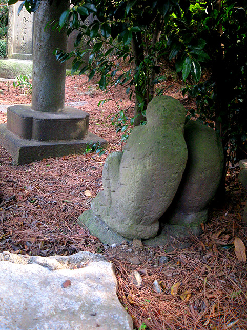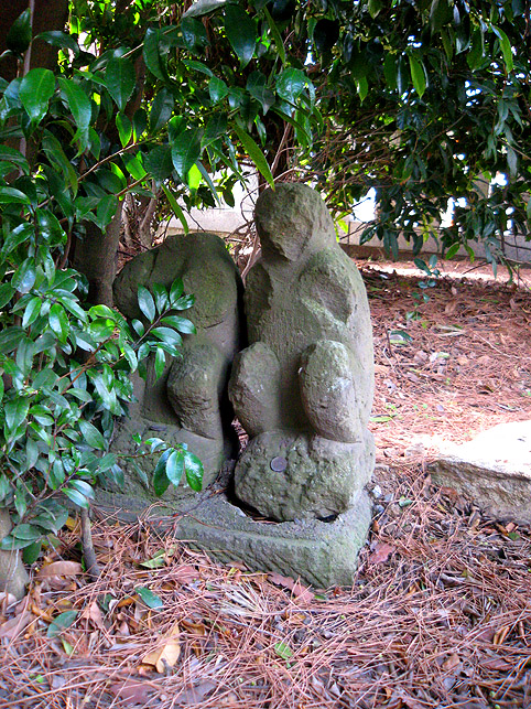 下新倉富士は、日の光りを浴びるとこんなにイイ感じ。(大泉富士や下練馬富士や浅久保富士と同系の丸吉講の築造) 昭和の頃の写真を見ると、登山道がくっきりしてるし、きれいな円錐の山容もわかるのですが、現在は植込みがこんもりしています。また、以前は石碑も全く違う位置にあったのがわかりました。 浅久保の文字が読める古い碑が斜面に倒れていたりしますが、 昭和10年以降の新しい講碑もあり、ほかにもいろいろ。特に明治4〜5年のものが多く、塚の築造は明治4年とされているようです。 この水盤が明治4年のものだからでしょう。左奥にいるのは、対の猿ですね。 壊されていることと、石の具合から察するに、これもかなり古そう。二匹並んでいるのは後年何かの都合によって並ばされたのでしょう。(台座も固定していないし) 頂上の浅間大神の碑がナゾです。裏に嘉永元年(1848)の年号が刻まれています。 でも、(近くの白子富士の築造が明治3年、浅久保富士が明治6年ということから)下新倉富士の築造年が明治4年説に落ち着いたのはいいとして、この山の模様は他の丸吉講とちょと違う。 峰の数が3つでなくて4つです。(左側が欠けているから5つの可能性も?でも5峰は。。。お伝え本の中に見たことあるけど、石碑にはないかな〜)4峰を使った紋を持つのは、丸瀧講と官位講と丸岩講くらい。てことは、白子富士を造った丸瀧講のものでしょうか??? 他の講からの奉納碑ってのもよくあることで、その可能性もあると思ってこの碑の奉納者名を調べてみたら、どうやら白子の人ではなくこの地域の人たちでした。う〜ん。てことは昔はここも丸瀧講で後に丸吉講になったとか?白子の丸瀧講(白子出身の商人が江戸から丸瀧講を持って来た)が伝わってもおかしくない。 でも嘉永年間は古すぎる。いや、時々ありえない年号を故意に刻むことはあります。昔の人の「シャレ」なのか「見栄」なのか。。。まあだからこそ、文字はあまり信用しなくてもいいのでは、と思ったりするんですが(笑)。 私は、富士塚は「謎多きことも魅力のひとつ」と思っていますから、これもロマンのうち。それに、近代/現代人があちこち移動して辻褄合わなくなっているものも多々ありますからね。(そう考えると、学者さんは翻弄されっぱなしで御苦労ですね) さて、下新倉富士のあるのは下新倉氷川八幡神社。なかなかいい社殿です。 5叉路の道からはこんなふう。謎多き富士塚のある一帯は、農村の風景が続いていました。。。 ★★★★★★★★★★★★★★★★★★★★★★★★