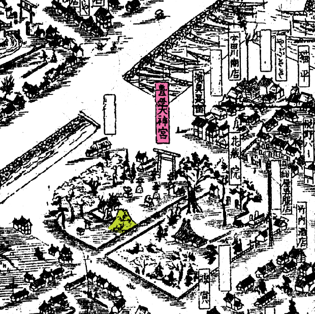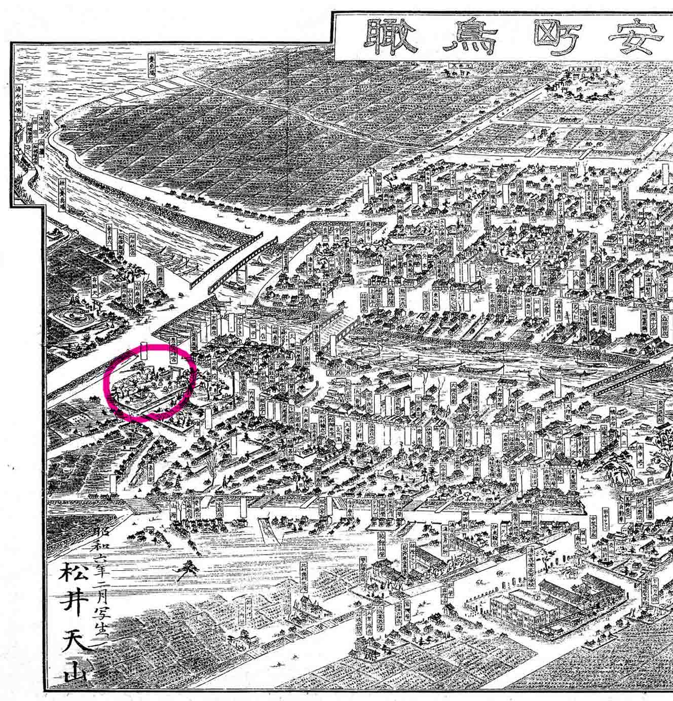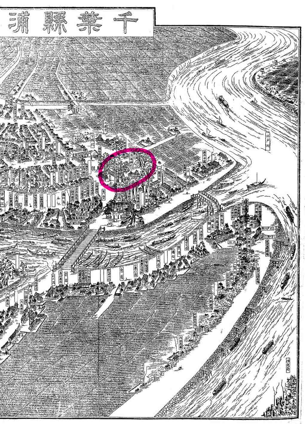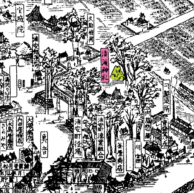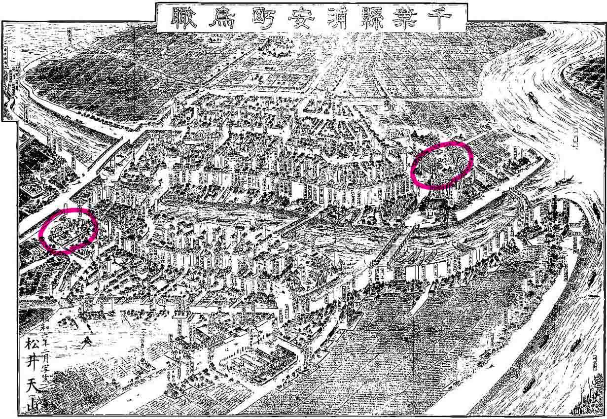 富士塚は「名所江戸百景」などの浮世絵や、「江戸名所図会」「江戸切絵図」「絵本江戸土産」の中に登場しますが、「江戸切絵図」の中で富士塚を見つけた時の喜びは格別ですね。 男性でもつい「カワイイ♪」ともらすほど。 それにもうひとつの楽しみ、江戸ではないですが、富士塚が描かれているものに「鳥瞰図」があったんです! 下の記事の を引いてみます。。。 「サムネイルが(画像が大きすぎて)出ません」と出るので(笑) こんな場所。 を引いてみると。。。 こんな場所。 文字はつぶれますが、全体図は こうなっています。「千葉県浦安町鳥瞰」の元町。 昭和6年当時の、海の方を向いた眺めです。東西線も走っておらず、田畑が広く続いています。もちろん、海もすぐそこ。新浦安なんてナシ。 赤い囲みの部分、右側は「堀江富士」の描かれた清瀧神社。左が「猫実富士」が確認できる豊受神社(表記は豊受天神宮)です。 この鳥瞰図は、大正から昭和にかけて活躍した鳥瞰図絵師、松井天山(本名 松井哲太郎)によって作成されました。天山は、昭和初期、千葉県各地の鳥瞰図を残しています。市川、津田沼、船橋、八幡町、検見川などなど。浦安もそのひとつです。鳥瞰図(復刻)は高価で購入可能ですが、JR船橋駅には、南口の壁に船橋の様子を描いた鳥瞰図が銅板のレリーフになって設置されています。 以前から浦安の鳥瞰図は知っていましたが、小さなサイズしか見たことがなかったので、全体の把握しかしていませんでした。ところが先日、これに富士塚が描かれているのを発見し、小躍りしました♪ そうだ!地元の方に見せてみよう!と大きく引き伸ばしA2サイズに作り直し、いつもお世話になっている方にプレゼントしました。 「え〜?こんなのがあったの♪ 面白いねぇ」 「どれどれ。昭和6年の? いやぁ自分が生まれた年だよ(笑)」 「てんぐ山(猫実富士)が絵になってるね! あ、こっち(堀江富士)もだ!」 「この銭湯の位置はおかしいね。 でも確か区画整理でこのへんは移動されたんだ」 「今は広い道路ができたけど、昔はこっちに小学校があって中心地だった」 「ああ、この川は塞がれて今は暗渠になってる」 「山本周五郎の下宿してた船宿はこれだよ」 「こっちが東京へ渡る船の船着き場。橋はまだできてないからね」 「日本橋のほうへ荷を運んだ蒸気船が出るのはこのへん」 「や、○○商店はこの頃からあったんだ!!!○○医院もだ!!!」 「子供の頃に遊んだのはこのへんかな。そのあと、キティ台風で水びたしだ」 「ほら、弁財天は海のほう。田んぼの真ん中だね♪ このあたりは低い土地だから、昔はしょっちゅう水をかぶった。だから、弁天様の松の木の根っこから水が越してこないように願かけさ。『根を越さねぇ』→『根越さね』。それが『猫実』に転じたんだね♪」 ルーペを覗き込みながら、あっと言う間に楽しい時間が過ぎました。 そんなご年配のお連れ合いと出かけたのは。。。 つづく。