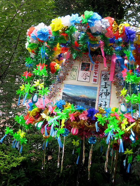 今年はカラッと晴れませんが、歩いていると、蒸し暑くて汗が出ます。 駒込富士の宵宮(お山開き初日)に向かう前に休憩タイム。古い地図を使って、昔の東大赤門内側にあった富士塚(椿山という築山に富士山の神様を勧請)が、駒込の富士神社に移された話などをし、プチレクチャーを兼ねたお茶をしました。 こんな差し入れもありまして♪♪♪ (富士山めろんぱんに関しては、後日たっぷり) 駒込富士神社に移動しました。広い境内には縁日の屋台がひしめきあっています。 「わあ、にぎやかですね」 「暗くなったらこんなもんじゃありませんよ〜♪」 頂上に飾ってある、鮮やかな花万灯です。急な石段を昇ってすぐのところにあるので、じっくり見ることはできませんが、本体は富士山型になっています。宵宮の午前中に、富士講の方たちがこれを担いで、この界隈をねり歩くのです。お山開きが始まりますよという告知でもあります。 紙面の都合上、本にはたった2行でしか紹介できず残念でしたが、実はちゃんとした歴史があります。参考資料からの抜粋を。 ………………………………………………………………………………………………… 古来陰暦六月の朔日を山開と云って、此日から富士登山を始めることになって居るに倣って、此祭は行はるゝので有って、二百年前までは、芝櫻田本郷町の富士神社より、當日左右の随神を此富士神社に送ることになって居たのが、争あってこのことを中絶し、今其随神(ずいしん)は駒込富士神社に飾られた儘になって居る。之を同時に久しく行はれて居たものには富士講中からもって来る萬燈が有る。萬燈と云ふのはつまり花傘を飾った高い行燈のことで、鉄砲洲の富士講中二三十名が、揃の中形の打扮(いでたち)にチリンチリンと鈴振り鳴らして、エッサモッサと景気よく一つの大萬燈かついで来て、篝火を焚いた富士神社の境内を練り廻って、やがて之を社前に立て飾って帰るので有る。享保の頃から行なわれていたもので、今も引つゞいて盛に行はれて居る。 若月紫蘭(1879〜1962)が書いた「東京年中行事」より。 ………………………………………………………………………………………………… ★中形:江戸で生まれた型染めの文様で、小紋よりわずかに大柄のものです。 昨年大変お世話になった富士講の方にお会いできました。N様、応援していただき、心より感謝しております♪ ご案内をしていると写真はなかなか撮れません。ちょっとズルして 昨年の様子はこちら。 今年が去年と違うのは、麦藁蛇の大きいのが復活したことです。(気合い入ってます!) 今、蛇の造りを研究中デス。(もしかしたら面白いものができるかも?) ★★★★★★★★★★★★★★★★★★★★★★★★