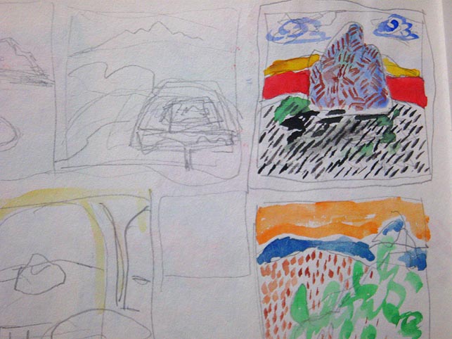 昔、NYに住んでいた頃、友人に教えられました。 彼は、白人ながら毎日お経をあげるブディスト。穏やかな性格なのにパンクロックのギタリストでした。今でも、ブルームーンの夜には彼のことが頭をよぎります。 今夜の月は、大きな笠をかぶっていましたね。とても幻想的でした♪ いつも満月の日には、普段なかなか捨てられないものを捨てようと決めているけど、今夜はさほど気にしない。2度目の満月ですし。 でも、捨てることを前提に、過去のものに目を通してみました。昔のことを振り返ってみたくなったのは、おそらく、数日前に他界したJ.D.サリンジャーのことを考えていたからでしょう。 昔のスケッチブックには、サリンジャーの本の中の、私のお気に入りのコトバ、 Meet you at the next corner! をタイトルにした作品のメモがたくさん描かれていました。 上の英文は、ナゾナゾの答えです。 「壁がとなりの壁に何て言ったか」 に対するのが 「角のところで会いましょう!」 というわけです。 どの小説だったか、ちょっと思い出せないけど。(ナインストーリーズの中のどれかかな?) たわいない答えだけど、私はこれが好きでした。次元を超えた感覚(トポロジー的?)というか、哲学的というか。壁はとなりの壁と接しているのに、個々に壁として成り立っている。お互いの壁の関係性は共存か対立か。壁に意志があるとしたら、双方は立場を入れ替わろうとするか。もしかしたら、夜中にこっそり変形しているかもしれない。なんてね。 そんな、若き日のいろんなスケッチは(面白すぎて)人には見せられない(笑)。 でも、中には今の自分につながるものがあったので、ちょっとだけアップしちゃいます。 少し前の日記に 富士塚みたいなものを描いてた!と書きましたが、ちょうどそれらのメモにあたるものです。 心象風景のような、にじみ出てくるイメージ群。 こんなのや、 こんなのの中に、 この右上に、小山(または巨岩)が出現しました。 下のオレンジ色のものもそうです。そして、それをもとに描いたのが、以前の日記(画像の中には一番左端)にも出てくる これ。(油彩と金箔) もちろんこれも富士塚を知らない頃の作品だけど、展覧会でこれを見た人から「あなたは自己完結しているね」と言われました。 その意味を、私はあまりいいようには受けとめなかったけれど、その人はその解説をしないまま、私にどこかの遺跡について話し始めました。 不思議な感覚でした。初めて会った人が何か暗示するかのように言った言葉の端々に、私は特別なものを感じていました。 その連作(発表していないけれど)には こんなものもありました。(油彩と蜜鑞) やはり、築山や岩のイメージ。そして宇宙のイメージもありました。 スケッチブックに戻ります。 別のページにあったのが、 こんなスケッチに これ!さすがにこれには驚きました。まるで、 10数年後、富士山をモチーフに創った、VOLCANDLEの構想そのものではないかと! 昔の自分て何だろう。そう思わざるをえませんでした。未熟とか若いとかは関係ないのかもしれません。魂はすでに知っている。「未来の記憶」を覚えている。表現者はただ、それに気づき、ひとつひとつたぐり寄せる作業をすればいいのだ。 そんな風に思う、ブルームーンの夜でした。 捨てることは手放すことではなく、発見することかもしれませんね。