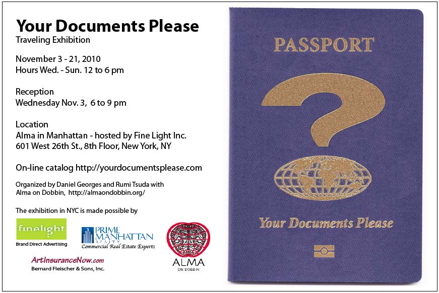 私も参加していた巡回展、"Your Documents Please" は、伊丹→横浜→ハンガリー→ドイツ→スロバキア→メキシコとまわり、最終地のNYで現在開催中です。 EXHIBITION DATES…………………………………………………………………………………………………… April 4, 2008 - May 16, 2008 ------ Museum of Arts and Crafts - Itami, Itami-shi, Japan August 2, 2008 - August 17, 2008 ----- ZAIM, Yokohama, Japan August 11 - August 16 ----- Galerie Paris, Yokohama, 1 block from ZAIM, Japan (added to ZAIM space 1 week only) November 28, 2008 (reception 6pm) - December 30, 2008 ------ 2B Galeria, Budapest, Hungary January 9 - February 2, 2009 ------ Galerie Kurt im Hirsch, Berlin, Germany February 12 - March 8, 2009 ------ GALERIA Z - Bratislava, Slovakia April 17, 2009 - May 8, 2009 ------ Galeria Ajolote Arte Contemporaneo, Guadalajara, Mexico Nov. 3, 2010 - Nov. 21, 2010 ------ Alma in Manhattan - hosted by Fine Light, 601 W. 26th St. 8th fl., NY, U.S.A. お疲れさま、旅をしてきたアート・パスポートたち。 それらは、旅を重ねるうち、磨耗するのとひきかえに、作家のアイデンティティが自ずからにじみ出てきたにちがいない。 作品の出来より、旅したことが一番のコンセプト。それもアーティストみんなで。 お近くの皆様、どうぞチェルシーのギャラリーにおでかけ下さい。 今月21日までですよ♪ 下は、オープニングのスナップから。