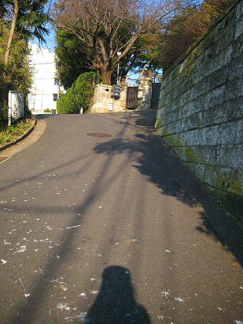 どうしても、その一帯の地形を見ずして帰れない。 一旦、参道を南に下り、外に出て、今度は東側脇を再び登ることにしました。 歩いたところにピンクのドットをつけました。 北を目指すと、船橋大神宮の北側、東西を走る道にヒットします。帰宅後知ったのですが、これが「東金御成街道」。家康が東金へ鷹狩りに出かけるためにつくられた道です。ちょうど街道に出たあたりが、丘の尾根っぽい。でも、他にも少し高いところもあるようなので、少し散策してみました。 道をはさんで西福寺の奥がややこんもりしている。中に入って奥に進むと、そこは墓地でした。木々が茂っていなければ、ぐるりと遠方の山々が見渡せたはず。一旦街道まで下りて、また高地を目指しました。 頭の中で、この土地に雨を降らせ、水がどう流れるか、勾配はどっちに向かっているか、などなどイメージして歩き回りました。 高い。低い。高い。低い。 地べたを這うように、舐めるように、歩を進め、地面からのメッセージを聞き取ることに集中するのはとても楽しい。実は、地図なしで歩いていたのです。自分の感覚だけが頼りです。それも贅沢なことですね。 こんな上り坂が一番好き。向こうに何があるのか、考えただけでわくわくします。向こうからやって来た猫とガチンコ。相手はしばしフリーズしてたけど、まもなく屋敷に入って行きました。丘の上に見えた建物(左奥)は峰台小学校。 その後、突然畑が開けたり、細い道に迷い込んだりしながら、気づくとまた街道に戻って来ました。でも、東側にこんもりした山が見えたので、最後のチャレンジ。 ああ、もう当初の目的がわからなくなってきました(笑)。ただひたすら地形を把握したい。 着いたところは日枝神社でした。(地図の中に「浅間前」のバス停名が見えますが、ここから南にある茂呂浅間神社のことのようです) つづく。