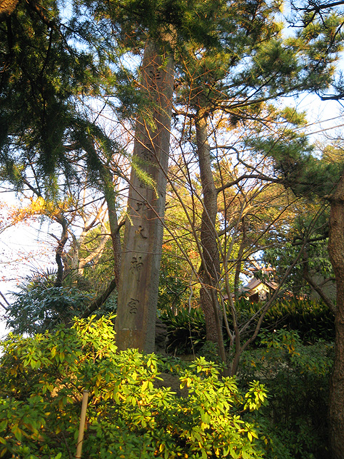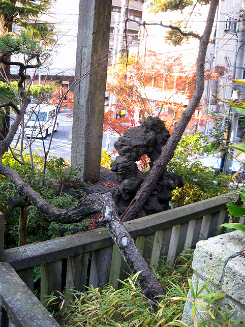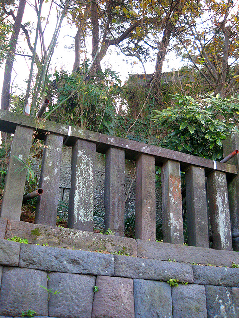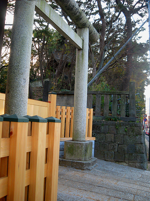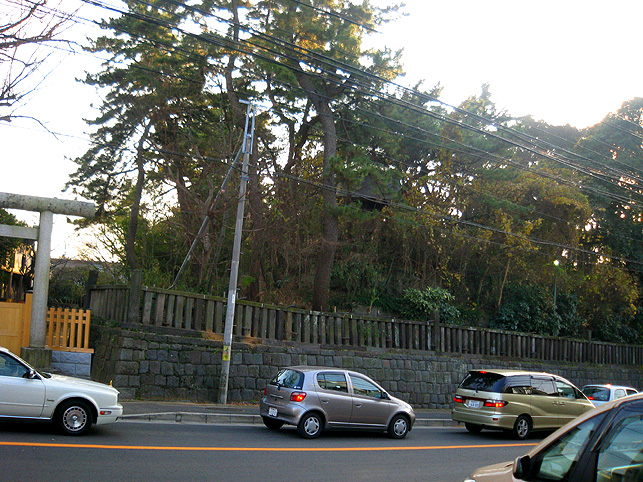 西福寺の側から(★のあたり) 船橋大神宮を見たところです。 もう一度、境内の見取り図を見ます。 街道を渡ってみました。 道路は渋滞ですね。左に鳥居があります。 鳥居をくぐると、常磐神社の脇を通る北参道につながります。 鳥居越しに見えるのは、盛り上がった山と祠。 中は常磐神社境内です。でも、浅間神社も中にあるといいます。常磐神社社殿は確認したので、もしかしたらこちらが浅間山(灯明台のある)から移された浅間神社かもしれません。 木々の葉が落ちている、今が一番見やすい時期でもなかなか見づらい。玉垣越しにうかがえるのは。。。築山の上に積まれた石垣と古い祠です。 今年の7月1日に確かめに来ようか。。。また悩みますね〜(笑)。