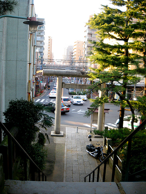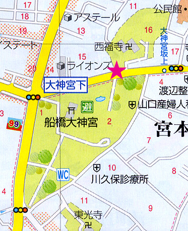 行きたい富士塚はいろいろあったけれど、ここを選んだのにはちょっとした理由がありました。少し前に、東京湾の灯台について調べることがあって、その際に、東京湾最古の灯台として知られている「船橋大神宮の灯明台」にふれ、それからずっと気になっていたのでした。 船橋大神宮の灯明台は、現在は使われてはいないけれど、その建築様式が魅力。そして、灯明台の立つ場所が富士塚かもしれない、というのが今回訪れた理由です。 私の予想では、稲毛浅間神社のような「浅間山」でした。でも実際訪れてみると、ちょっと違った印象を受けました。 今は、海岸線が遥か彼方にあり、昔の面影とはほど遠いはずですが、木造の灯明台は確かにライトハウスの雰囲気でした。宮司さんによると、毎年成人式前夜に「灯明台祭」があり、夜5時から灯りがともり、神事があるとのこと。次回は1月10日です。ちょっと気になるイベントですよ♪ で、浅間神社の存在はというと、普段は閉まっているけれど灯明台の隣に現存するそうで、しかも宮司の言葉「奥は山になっているんですよ♪」に、これはちょっと探検の価値あり、と思いました。 江戸名所図会にも描かれているこの船橋大神宮は、意富比(おおひ)神社ともいいます。左下の海老川を青く着色、麓にある鳥居と本殿を赤くしました。右下の鳥居から入るのが表参道。中腹には土俵があり(黄色)、奥に浅間神社(ピンク)。盛り上がったところに、少々強引に緑色をつけました。全体がなだらかな山なのですが。 つづく。 |
