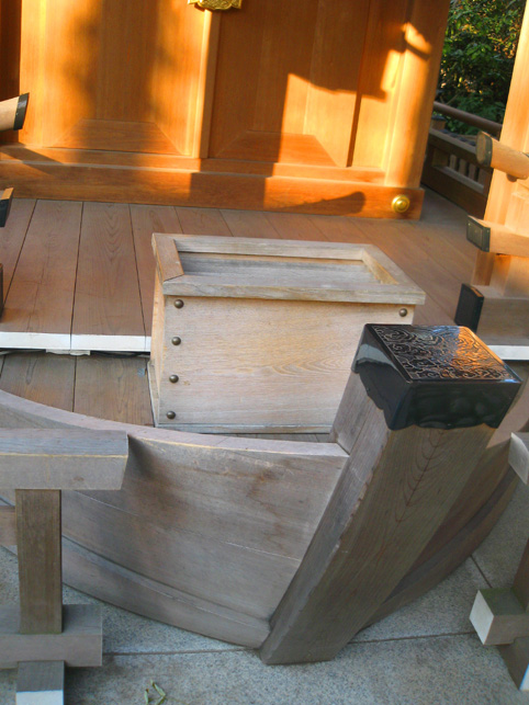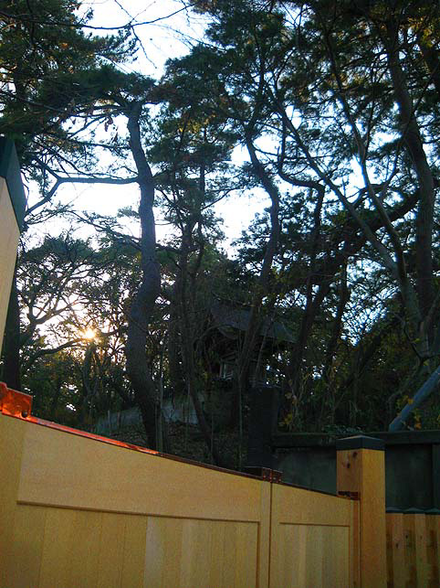 それが浅間山と呼ばれる高台でした。ちょうど江戸名所図会に緑色につけたあたり。 海老川のふもとから続くゆるやかな丘の上に、さらにこんもりと盛り上がりがあるわけです。ここは「覆宮塚」という名の円墳(「意富比神」の墳墓)だという説があるのですが、その塚に浅間神社が祀られ浅間山と呼ばれたらしいです。古墳だったところが富士塚に使われた(と言われる)ケースもありますから、不思議ではありません。 現在の境内見取り図(御由緒に記載)にも、緑色をつけてみました。これには浅間神社は記されていないけれど、宮司が「ある」というのであるのでしょう。 この記念碑は、大鳥神社のすぐ南側に位置しています。(横に通る参道を隔て) しかし、この図(昭和27年作成。船橋中央図書館ロビーに掲げてあります)を見ると、その記念碑あたりもしくは大鳥神社の位置に浅間神社があった? ナゾといえばナゾですが、考えてみれば、時代時代で人は土地を現世のため合理的に活用するものです。また、管理する神社や氏子衆の意図により、表記が変わる可能性もあります。古墳だったところが、のちにその意識が薄れたり、一旦忘れられることもあるでしょう。 仮説として。かつて古墳だった塚に浅間神社が祀られ、富士塚のように富士山扱いつまり浅間山とされた。その後、氏子である漁師たち(ここは漁師町でした)により、その頂上に建てられた常夜灯が立派な灯台に変わった。そして浅間神社は北側に移動した。 現在、浅間神社は大鳥神社の奥。玉垣の中で、通常は公開されていませんが、神社によって守られていることも確かです(毎年7月1日の富士山の山開きの日には例祭あり)。 大鳥神社は西向き。その前の参道を進むと閉ざされた門があり、手前右手に、先の看板(灯明台に関する)があるのです。 覗けばここまで見ることができます。う〜ん。浅間神社はあの中かなぁ。でも、見取り図には常磐神社とあるし。。。中に入りたいなぁ。 と、思っていたところ、幸運はやって来ました♪ 門を開けて作業をする方たちに、ちょっとだけ見せてもらうことができたのです。でも、もともと普段は入ってはいけないところ。私も奥へは踏み込まず、入れただけでも有り難いと思い、ナゾはナゾのままにしておきました。 実は時々、マナーの悪い研究者の話を聞きます。調査とはいえ、地元の人たちが大事にしているところや品々を荒らす人がいるそうです。いや、決して壊したりするわけではないですが、お参りもせずにいきなり写真を撮ったりすることだって、地元の人にとっては荒らされた気持ちになるわけで。よくわかりますよ。 よかった。私は絶対そういうこと、ないですから。地元の方の気持ちを害するくらいなら、謎を解明しなくたっていいと思っています。 そのぶん、コミュニケーションから情報を得ることができます。 作業員のおじさん情報。 「昔はね、ここは見晴らしよくってね、筑波山まで見えたんだよ♪」 「灯明台祭?その前に初詣においで。上に登れるよ。中には4本の柱が斜めにあってしっかりした造りだ。灯台守の家族が住んでいた階下は和室だけど、灯をともしたところは六角形の洋室だよ。光は今のららぽーとまで届いたんだってさ」云々。 時間のある方は、お正月に是非! つづく。。。