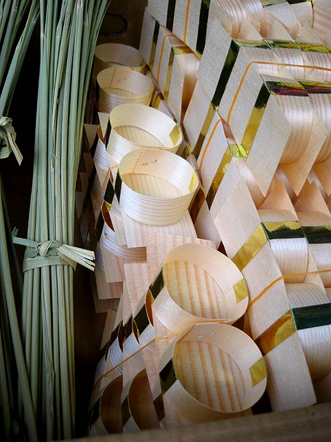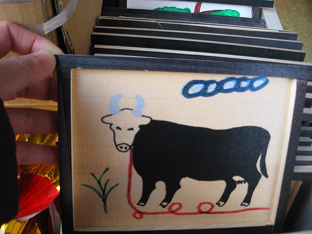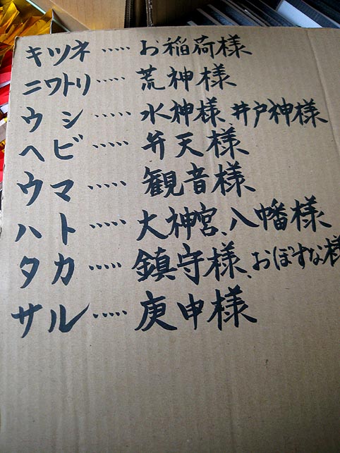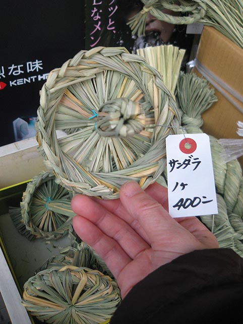 富士塚からはなれますが、神社の近くで出会った品々をご紹介♪ 昨年末のことです。 仏具や神具を中心に、あらゆる雑貨を取り扱う小さなお店の店先で遭遇しました。 新年を迎えるにあたり、この近辺では、家中の神々にお供えをしたりするそうです。そのために使われるいくつかの神具が鮮やかで、目が釘づけになりました。 いろんな動物の絵馬。ふにゃふにゃした面白い絵柄がなんとも魅力です。 このように、それぞれの神様に合わせていろんな絵馬が揃っていました。おぼすな様は産土様のことね。 こちらは何にでも使える「拝み女」絵馬ほか。 館林市の富士嶽神社の絵馬堂にある、この絵馬を思い出しました。 松飾りの横には、経木で作られたお供えの器。 サンダラボッチが由来のサンダラ。い草を編んだものです。丸い部分を土台にして、中央に何かを立てるという。「何か」は、お店の人とお客さんから説明を受けたけど、ちょっとわかりませんでした。御幣のようなものと解釈しましたが。。。 とにかく、これらを大晦日までにお供えするそうで、皆さんせわしそうでした。 それにしても、土地特有のしきたりには、しばしばユニークなビジュアルが顔を出します。これらを見ていたら、私が住んでいたNYのブルックリンを思い出しました。スペイン語が飛び交うよろずやには、カトリックの品々があふれていたっけ。安価でかわいいキャンドルや、マリア像をプリントしたものたちは、私もほしくなったくらい。また、ブードゥー屋さんにはもっとすごいものも(笑)。 雑貨あつかいに見えるけど、信仰の、小さなカタチはキッチュでカラフル。国が違っても共通するパワーがあるもんです。 私は、キッチンの火まわりに、トリの絵馬を小さな注連縄と一緒に掲げました。 経木の器は、美しすぎて使えず。お餅と酢の物をお供えするためのものです。